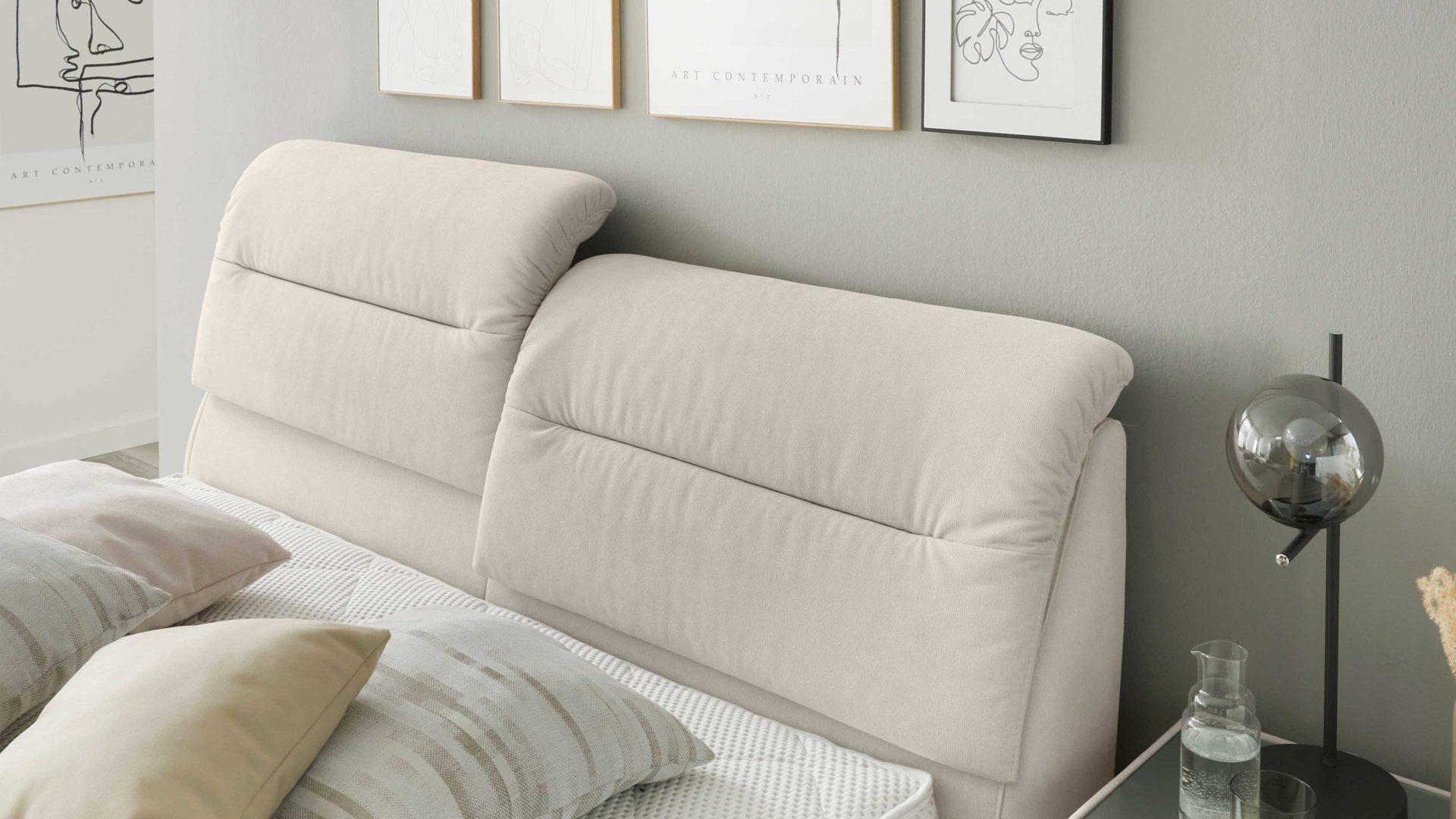 Die Basis bildet der Taschenfederkern-Unterbau. Er umfasst einen robusten und stabilen Massivholzrahmen sowie zwei rundum stoffbezogene Matratzen. Durch die integrierte CLIMABOX trägt der Unterbau zu einem besseren Schlafklima bei. Die Antirutsch-Einsätze stellen sicher, dass die Matratzen an Ort und Stelle bleiben.