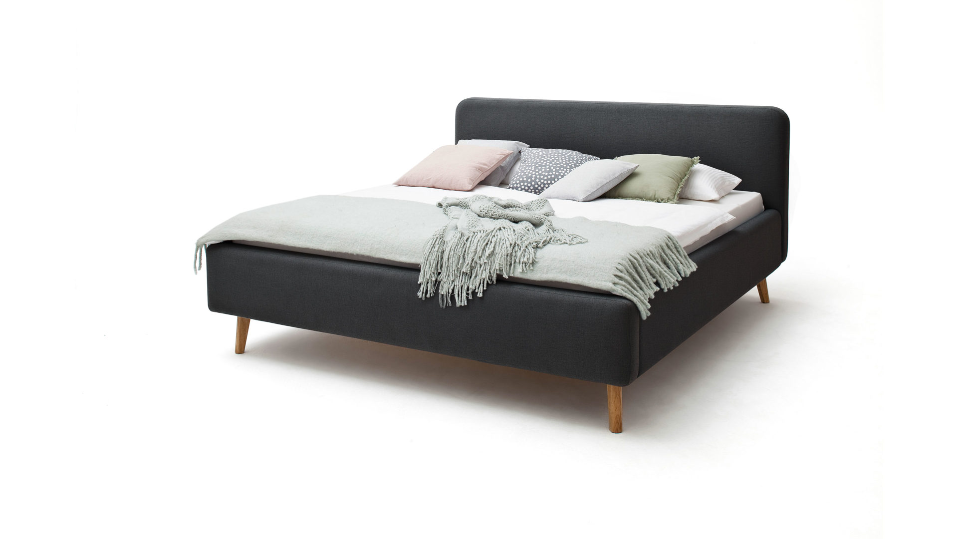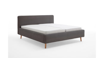 Das Polsterbettgestell Mattis begeistert durch die elegante Optik sowie die hervorragende Material- und Verarbeitungsqualität. Es kombiniert einen anthrazitfarbenen Flachgewebe-Bezug mit eichefarbenen Holzfüßen. Sowohl die Bettseiten als auch das Polsterkopfteil sind glatt bezogen. Letzteres lädt Sie ein, sich anzulehnen, wenn Sie abends im Bett vor dem Schlafen noch fernsehen oder in einem Buch lesen.