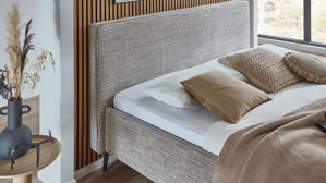 mit glatt bezogenem Polsterkopfteil, vorne und hinten mit umlaufendem Keder und gepolsterten Bettseiten
