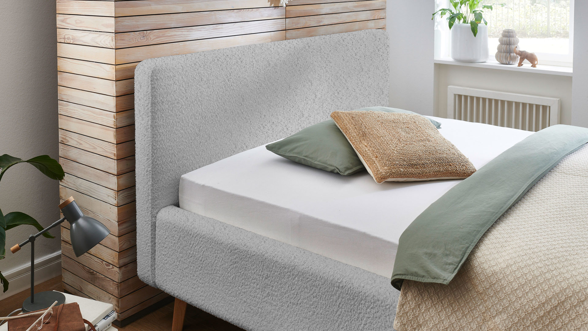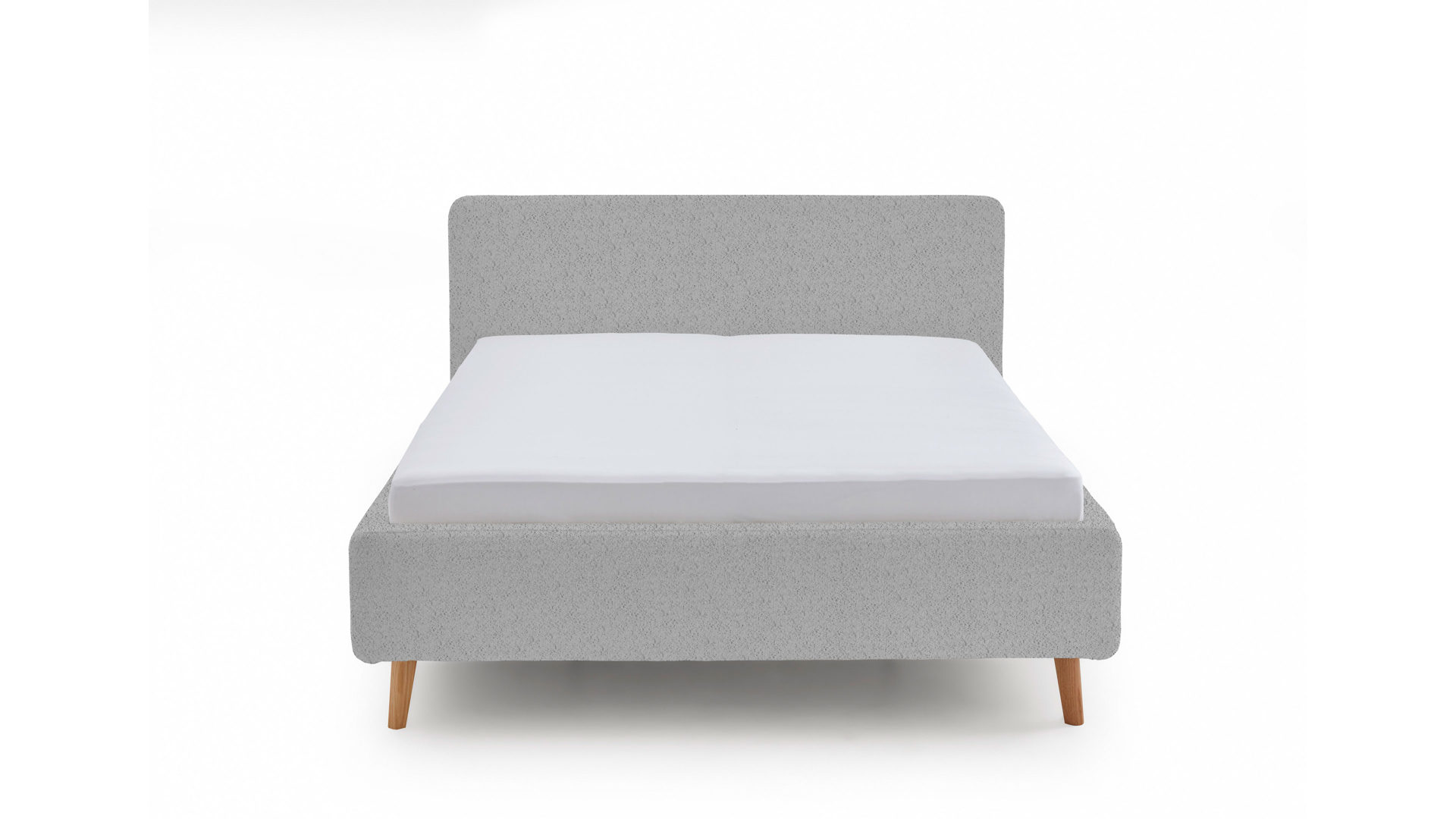 Das Polsterbettgestell Mattis begeistert durch die elegante Optik sowie die hervorragende Material- und Verarbeitungsqualität. Es kombiniert einen grauen Boucle-Bezug mit eichefarbenen Holzfüßen. Sowohl die Bettseiten als auch das Polsterkopfteil sind glatt bezogen. Letzteres lädt Sie ein, sich anzulehnen, wenn Sie abends im Bett vor dem Schlafen noch fernsehen oder in einem Buch lesen.