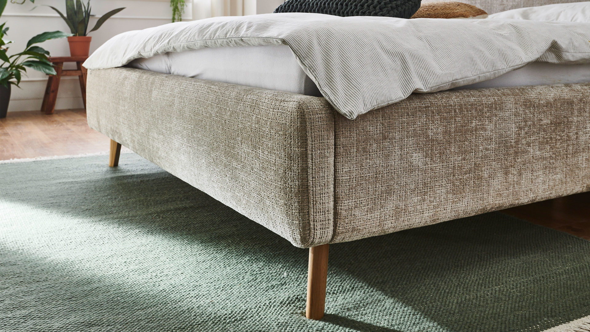 Das Polsterbettgestell Mattis begeistert durch die elegante Optik sowie die hervorragende Material- und Verarbeitungsqualität. Es kombiniert einen beigefarbenen Chenille-Bezug mit eichefarbenen Holzfüßen. Sowohl die Bettseiten als auch das Polsterkopfteil sind glatt bezogen. Letzteres lädt Sie ein, sich anzulehnen, wenn Sie abends im Bett vor dem Schlafen noch fernsehen oder in einem Buch lesen.