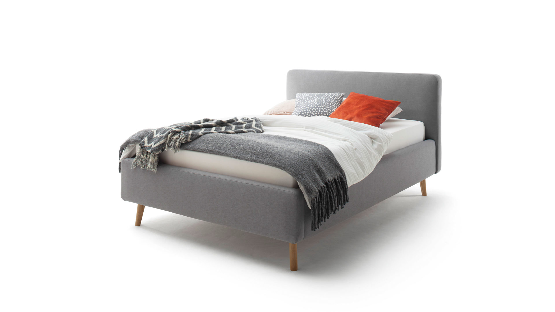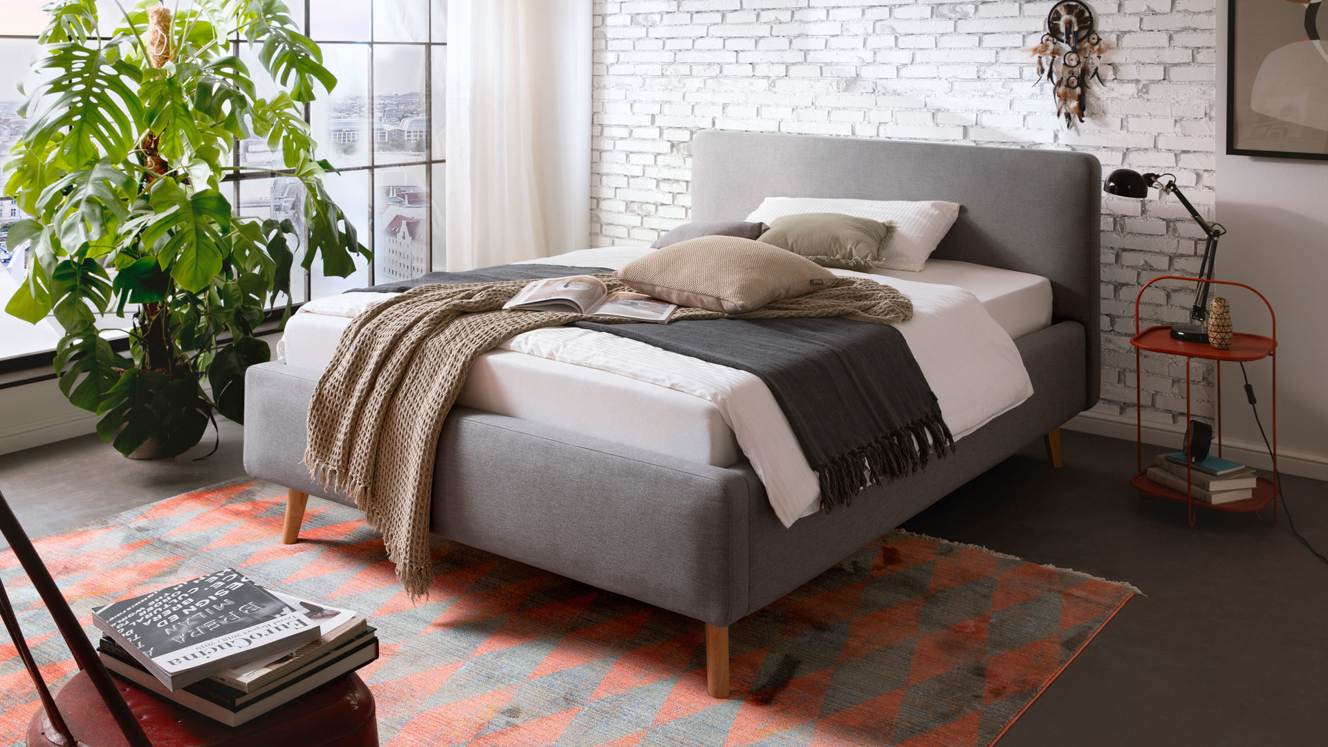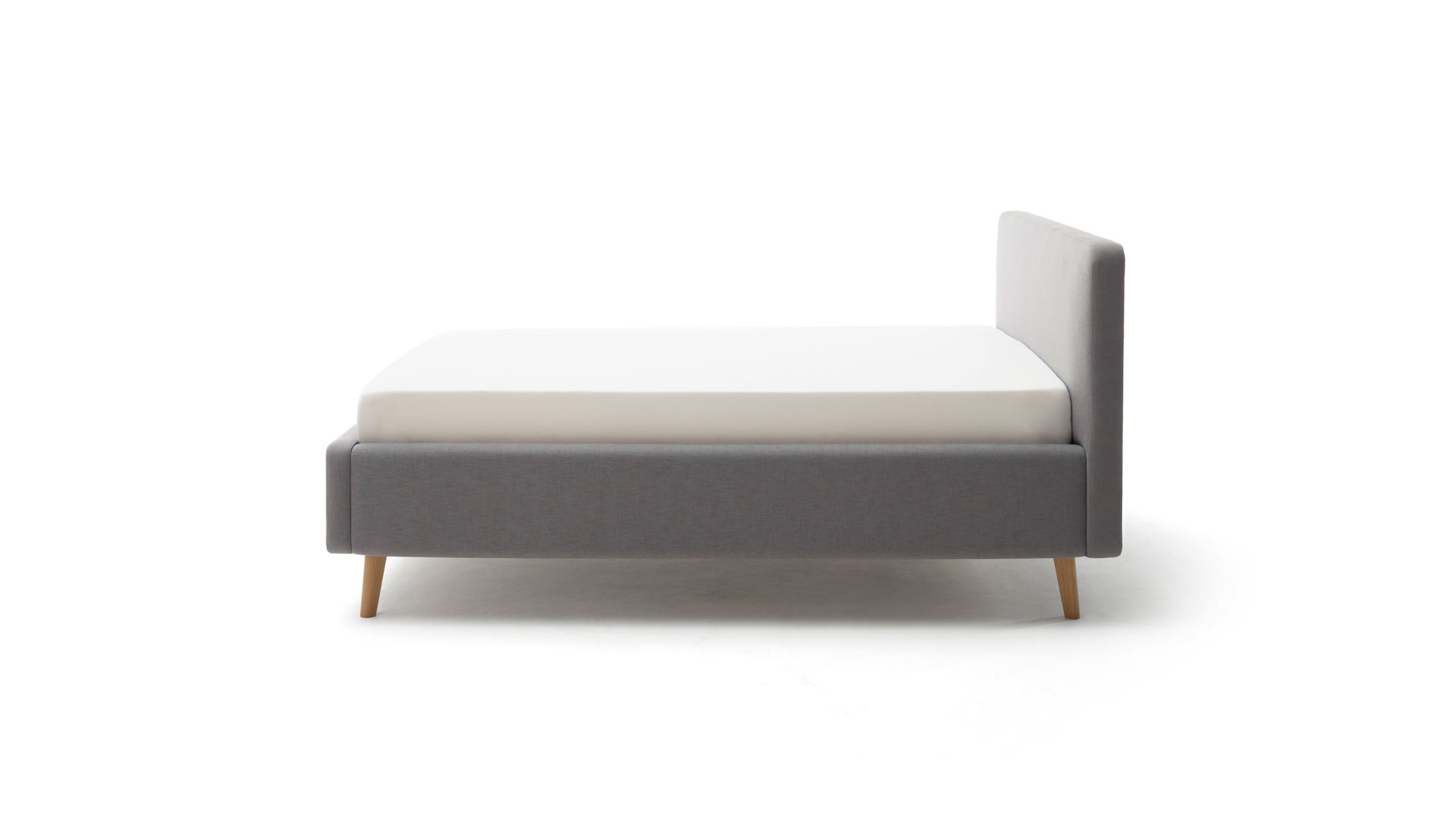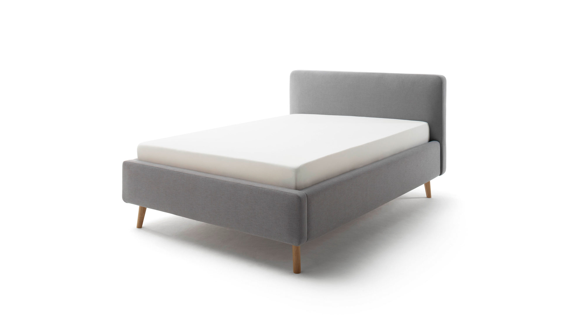 Das Polsterbettgestell Mattis begeistert durch die elegante Optik sowie die hervorragende Material- und Verarbeitungsqualität. Es kombiniert einen hellgrauen Flachgewebe-Bezug mit eichefarbenen Holzfüßen. Sowohl die Bettseiten als auch das Polsterkopfteil sind glatt bezogen. Letzteres lädt Sie ein, sich anzulehnen, wenn Sie abends im Bett vor dem Schlafen noch fernsehen oder in einem Buch lesen.