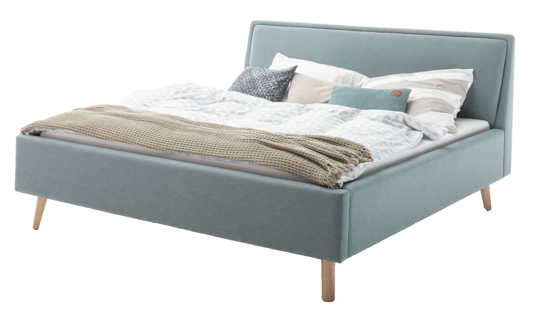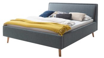Das Polsterbettgestell Mattis begeistert durch die elegante Optik sowie die hervorragende Material- und Verarbeitungsqualität. Es kombiniert einen eisblauen Flachgewebe-Bezug mit eichefarbenen Holzfüßen. Sowohl die Bettseiten als auch das Polsterkopfteil sind glatt bezogen. Letzteres lädt Sie ein, sich anzulehnen, wenn Sie abends im Bett vor dem Schlafen noch fernsehen oder in einem Buch lesen.