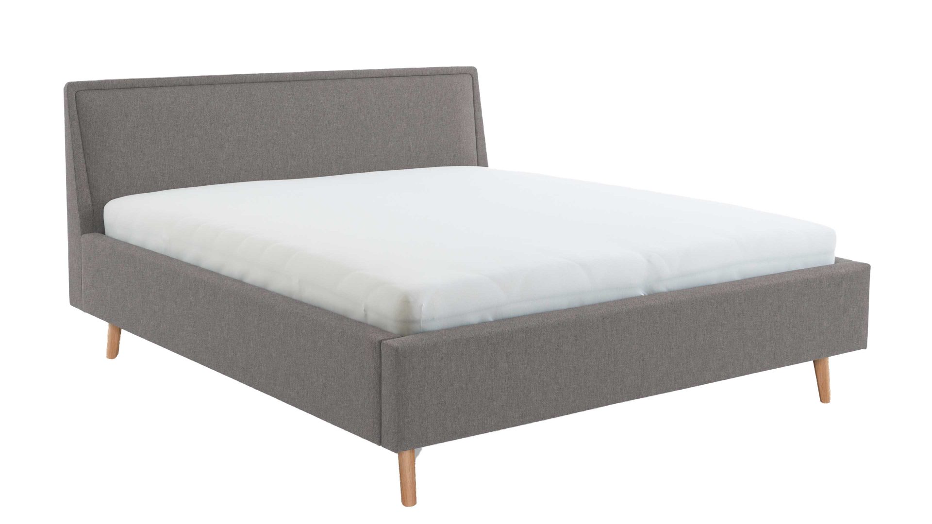 Pure Eleganz bringt das Polsterbettgestell Mila in Ihr Schlafzimmer. Die eichefarbenen Füße wirken filigran und verleihen diesem Modell eine luftig leichte Ausstrahlung. Ausgestattet ist das schicke Bett mit dem Bezug Capri 4150 aus hellgrauem Flachgewebe.