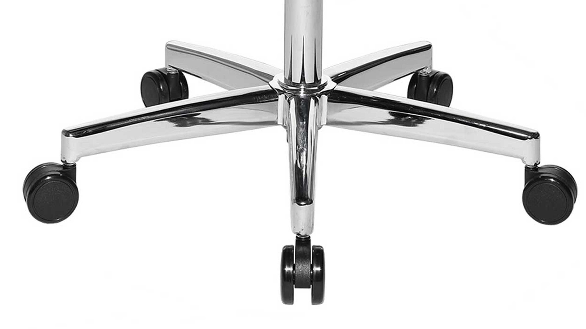 Der komfortable Flachsitz des Bürostuhls besticht durch seine Knierolle und einer sogenannten Punktsynchron-Mechanik, wodurch die Federkraft individuell auf das Körpergewicht anpassbar und mehrfach arretierbar ist. Doch auch auf die Optik wurde hier großen Wert gelegt: Der schwarzweiße Sitz des Drehstuhls wird aufgefangen von einem edel verchromten Drehkreuz. Die maximale Nutzergröße liegt bei ca. 192 cm, das maximale Nutzergewicht bei ca. 110 kg. Die maximal empfohlene Nutzungsdauer pro Tag sollte acht Stunden nicht überschreiten. Made in Germany.