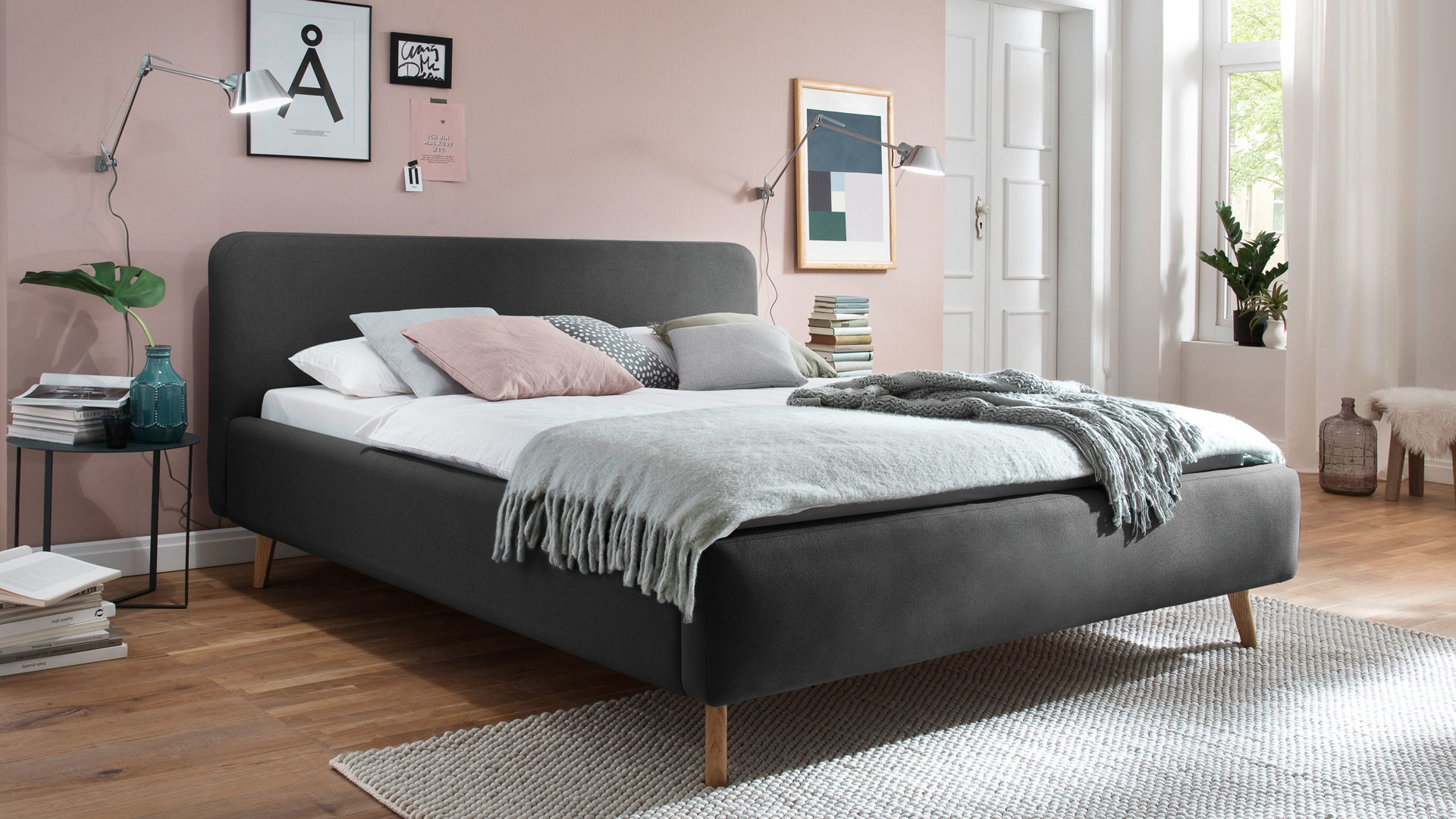 Das Polsterbettgestell Mattis begeistert durch die elegante Optik sowie die hervorragende Material- und Verarbeitungsqualität. Es kombiniert einen anthrazitfarbenen Flachgewebe-Bezug mit eichefarbenen Holzfüßen . Sowohl die Bettseiten als auch das Polsterkopfteil sind glatt bezogen. Letzteres lädt Sie ein, sich anzulehnen, wenn Sie abends im Bett vor dem Schlafen noch fernsehen oder in einem Buch lesen.
