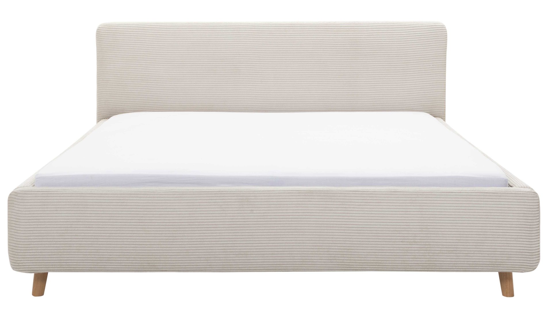 Mit den eichefarbenen Holzfüßen und dem beigefarbenen Breitcordbezug bringt das Polsterbettgestell Mattis maritimes Flair in Ihr Schlafzimmer.