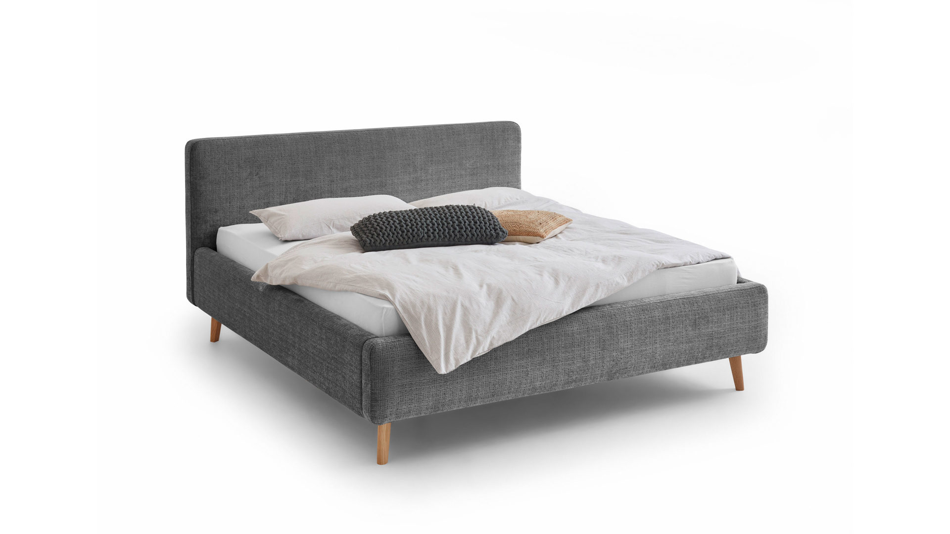Das Polsterbettgestell Mattis begeistert durch die elegante Optik sowie die hervorragende Material- und Verarbeitungsqualität. Es kombiniert einen anthrazitfarbenen Chenille-Bezug mit eichefarbenen Holzfüßen. Sowohl die Bettseiten als auch das Polsterkopfteil sind glatt bezogen. Letzteres lädt Sie ein, sich anzulehnen, wenn Sie abends im Bett vor dem Schlafen noch fernsehen oder in einem Buch lesen.