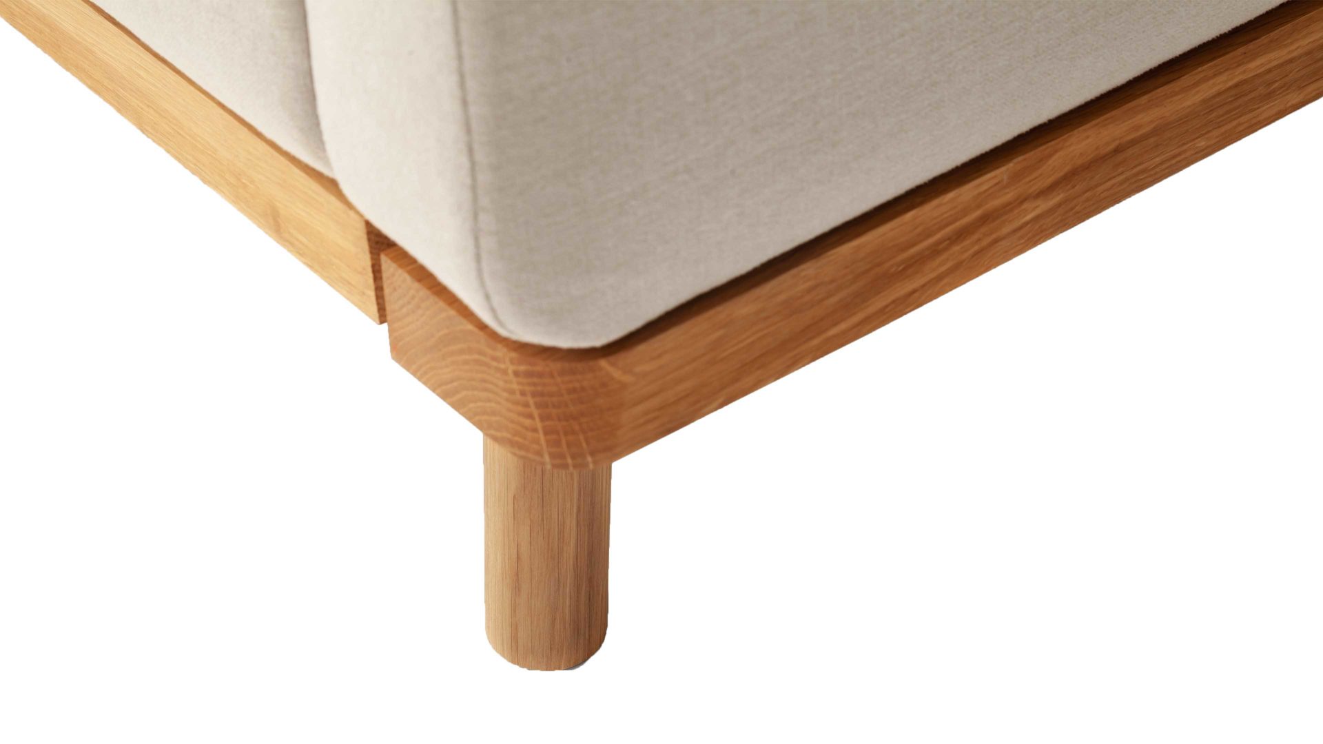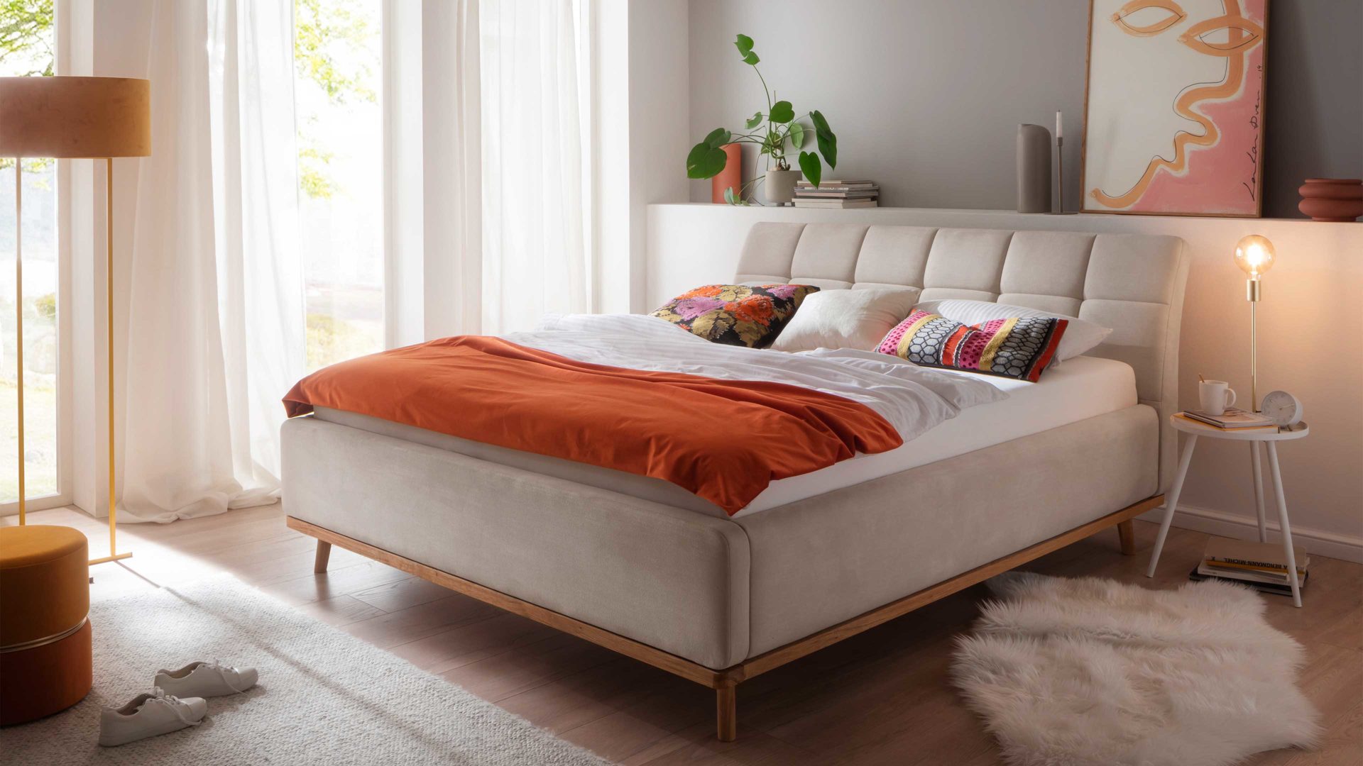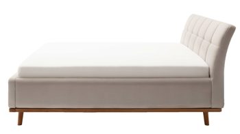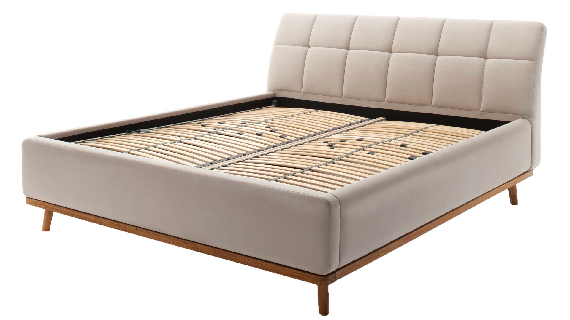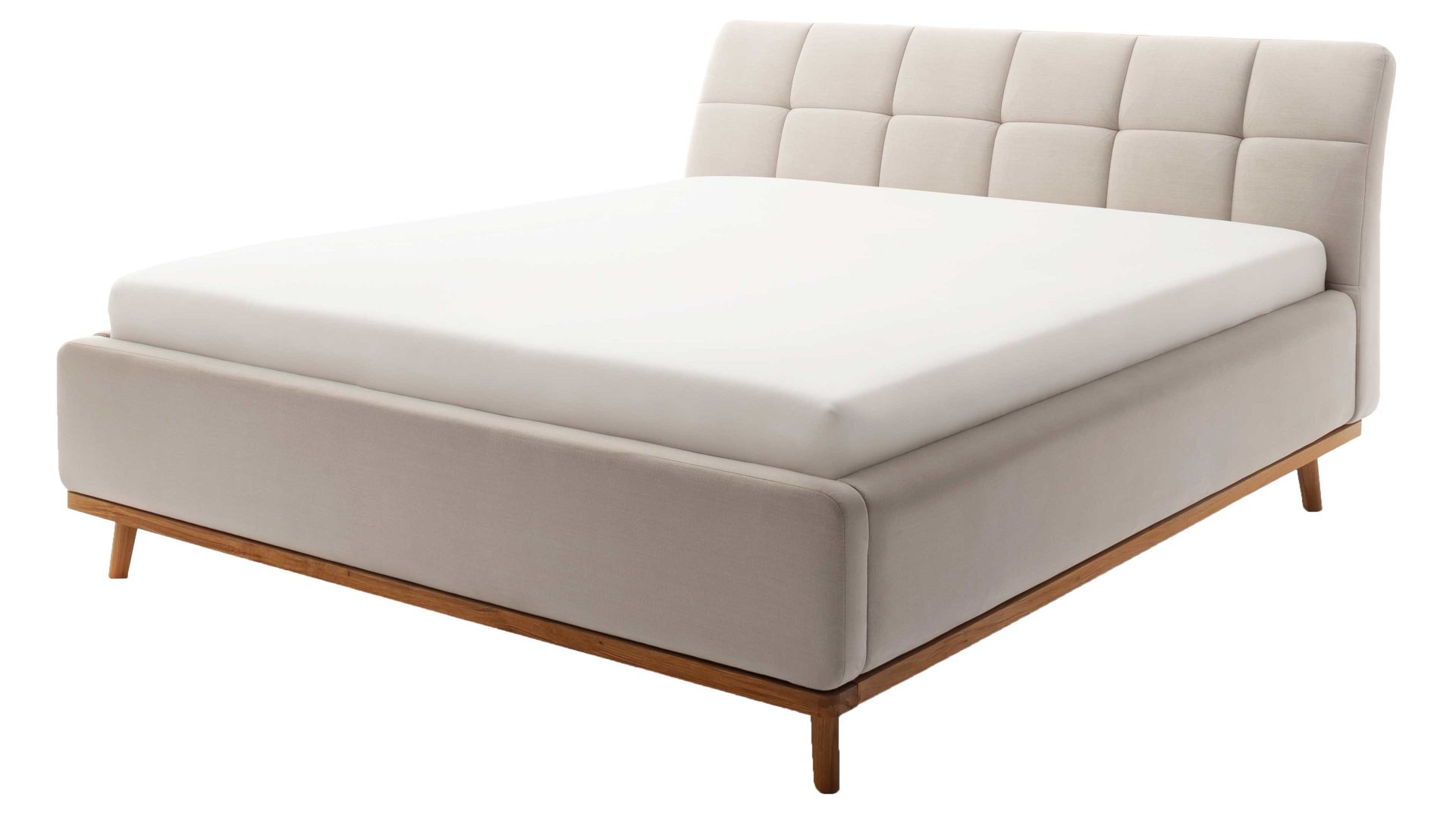 Pure Eleganz bringt das Polsterbettgestell Mila in Ihr Schlafzimmer. Es ruht auf einem eichefarbenen, massiven Holzrahmen. Die ebenfalls eichefarbenen Füße wirken filigran und verleihen diesem Modell eine luftig leichte Ausstrahlung. Ausgestattet ist das schicke Bett mit dem Bezug Capri 3723 aus beigem Flachgewebe.