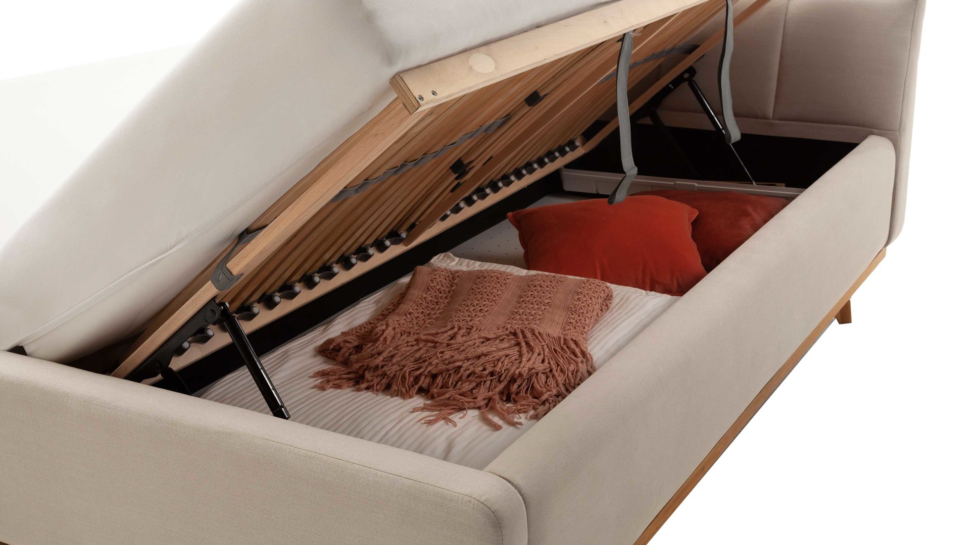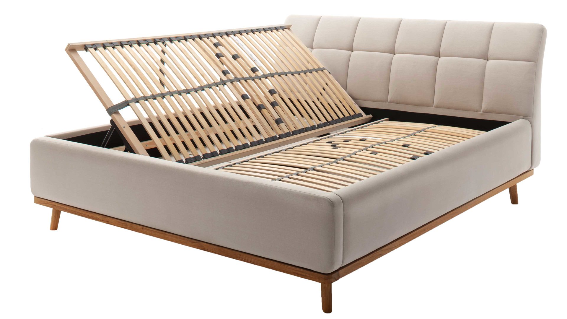 Im Inneren liegen zwei jeweils seitlich zu öffnende Federholzrahmen mit 28 starren Leisten. Dank der möglichen Härtegradverstellung liegen Sie immer genau richtig. Der integrierte Bettkasten ist belüftet und geteilt - für eine Extramaß an Ordnung und Stauraum bei dennoch optimaler Luftzirkulation.