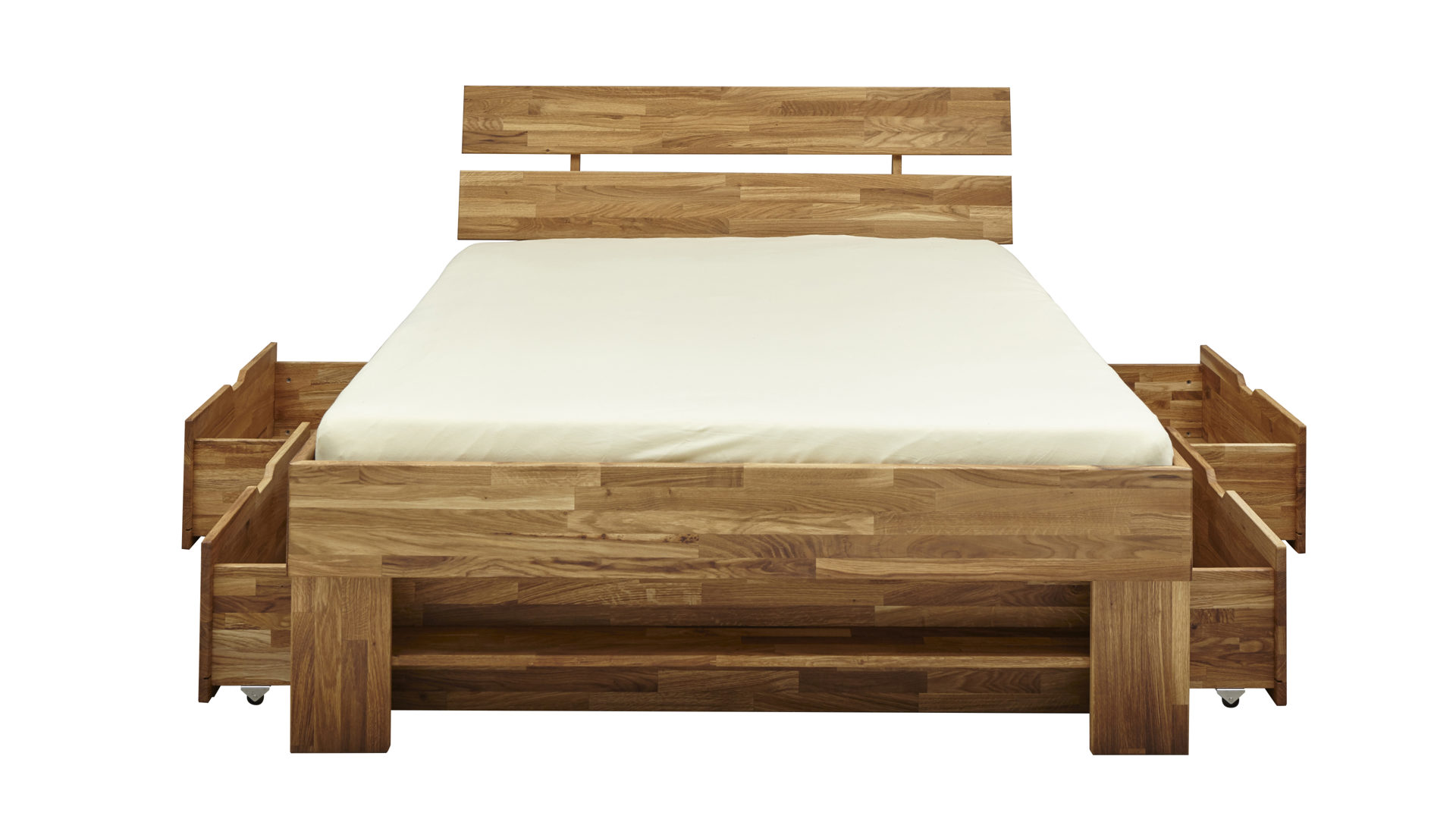 Sie liegen wunderbar bequem auf dem Bett aus keilverzinkter geölter Wildeiche, das insgesamt ca. 145 x 88 x 215 cm (BxHxT) groß ist. Außergewöhnlich praktisch ist der Stauraum, der sich Ihnen unter dem Einzelbettgestell in vier inkludierten Bettkästen bietet. Die Kästen auf Rollen haben Innenmaße von ca. 78 x 18 x 64 cm (BxHxT) und schaffen viel Platz für Kissen und Decken.