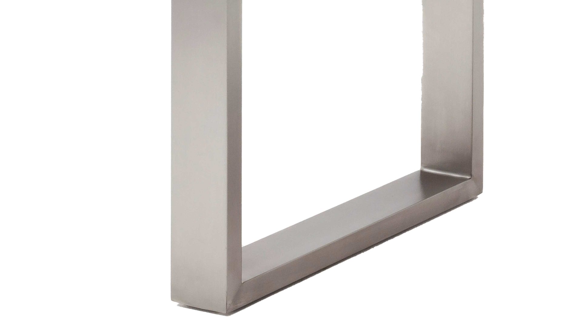Er kombiniert natürliche und moderne Materialien und Farben zu einem attraktiven Ganzen, das die Blicke auf sich zieht und jedem Esszimmer das gewisse Etwas verleiht. Auf dem Kufengestell aus gebürstetem Edelstahl, das robust konzipiert ist und damit die nötige Standfestigkeit des Tisches gewährleistet, sorgt die Tischplatte aus lackiertem Wildeichenholz für eine wunderbar warme, einladende Ausstrahlung.