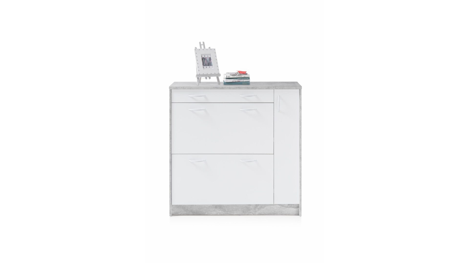 Der Schuhkipper Optimus ist enorm stilvoll designt und ausgesprochen praktisch. Mit der gelungenen Kombination aus herausragender Beton-Nachbildung und strahlend weißen Kunststoffoberflächen bringt der Schuhschrank moderne Eleganz in den Raum, in dem Sie ihn platzieren. Akzente setzen die alufarbenen Griffe - sie heben sich in gewisser Weise ab, verbinden sich auf der anderen Seite aber auch perfekt mit dem Betonton und dem Weiß des attraktiv gestalteten Korpus.