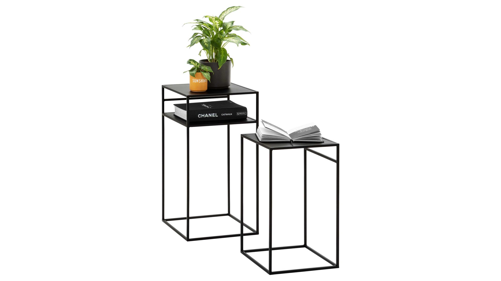 Dieses hochwertige Beistelltisch-Set repräsentiert die Eleganz schlichter Modernität. Aus klassisch mattschwarz lackiertem Metall einschließlich Vierkantrohr-Gestell gefertigt, erscheinen die zwei Beistelltische puristisch und sind dazu enorm robust und langlebig.