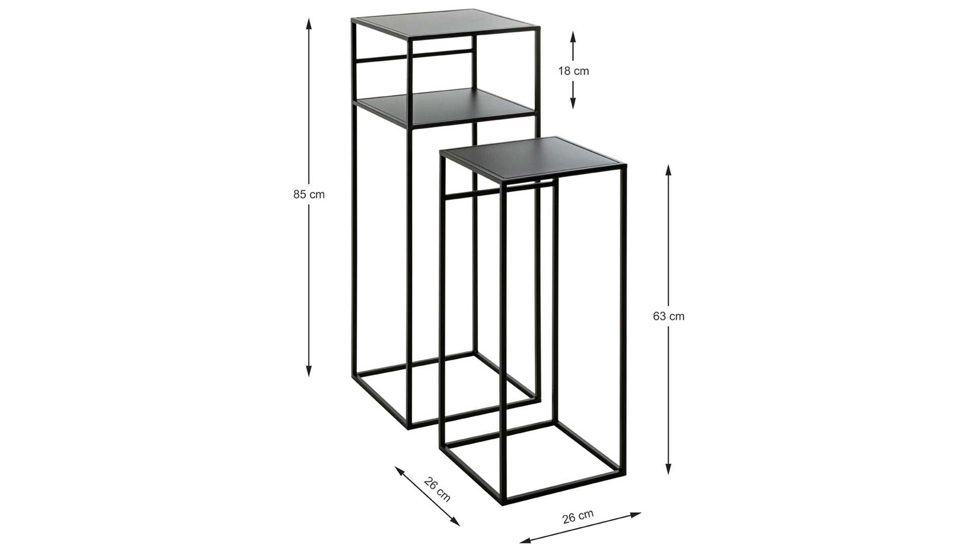 Die Maße des kleineren Tisches betragen ca. 26 x 63 x 26 cm (BxHxT), während sich die des größeren auf ca. 30 x 85 x 30 cm (BxHxT) belaufen. Letzterer bringt einen Ablageboden mit, der zusätzlichen Stauraum bietet - beispielsweise für ein Magazin oder Buch.
