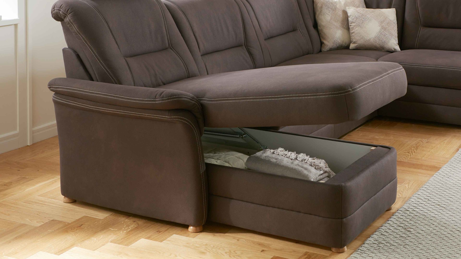 Bei der Aufklappfunktion handelt es sich um einen praktischen Funktions-Mehrpreis für die Canapés aus dem Modulmaster-Polsterprogramm MM-PP1067. Der manuell aufklappbare Stauraum ist innen weiß beschichtet und belüftet. Er eignet sich zum Verstauen verschiedener Wohntextilien, aber auch zur Aufbewahrung von Spielzeug und sonstigen Gegenständen.