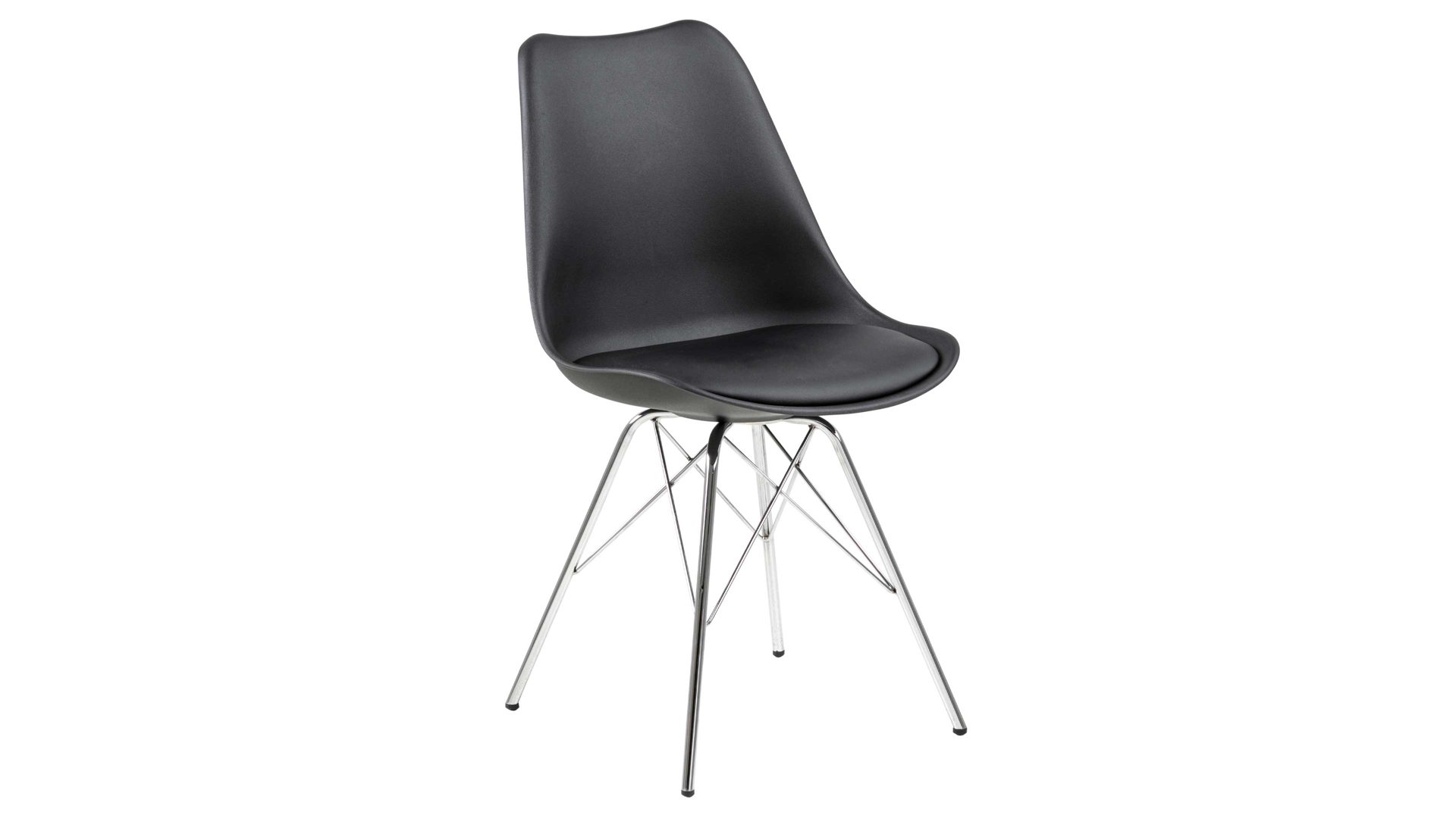 Dieser Polsterstuhl verkörpert puristische Eleganz. Als stabile, dabei aber wunderbar filigran designte Basis fungiert ein verchromtes Stahldrahtgestell. Darauf befindet sich eine schwarze Sitzschale aus robustem Kunststoff. Sie ist rundherum mit schwarzem Kunstleder bezogen, das sowohl qualitativ als auch optisch und haptisch überzeugt. Die Farbgebung sorgt für eine klassisch-schlichte Ausstrahlung.