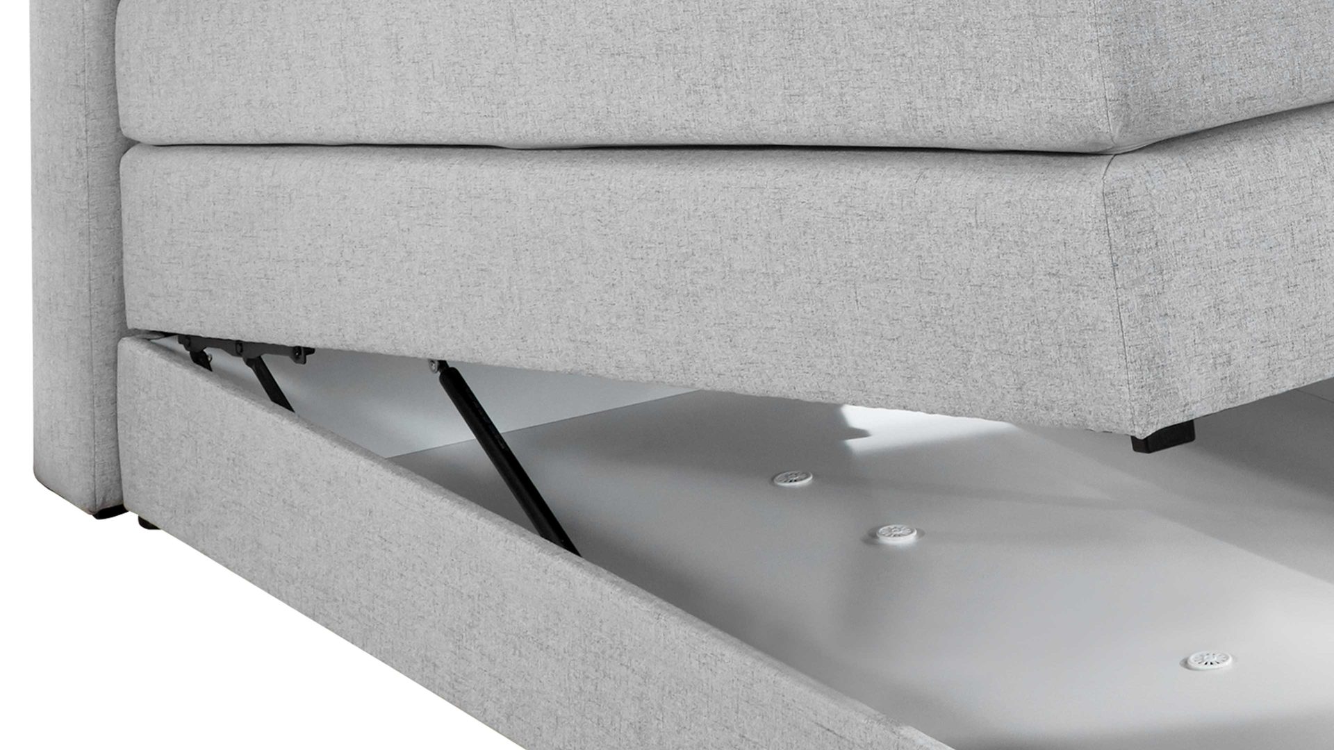 Das Basisgestell und die Sichtseiten der Matratze sind stoffbezogen; die ca. 140 x 200 cm (BxL) große Liegefläche ist mit Mikrofaser versteppt; und der Bettkasten präsentiert sich innen weiß beschichtet. Über den Eingriff im vorderen Bereich und die Gasdruckfeder öffnen Sie den Bettkasten. Dieser verfügt im Boden über eine Ventilationsöffnung und ist demnach atmungsaktiv.