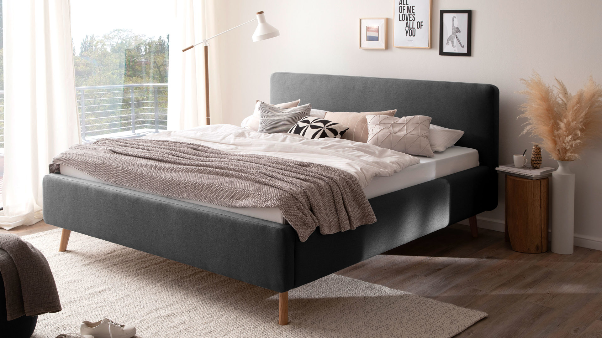 Das Polsterbettgestell Mattis begeistert durch die elegante Optik sowie die hervorragende Material- und Verarbeitungsqualität. Es kombiniert einen anthrazitfarbenen Flachgewebe-Bezug mit eichefarbenen Holzfüßen. Sowohl die Bettseiten als auch das Polsterkopfteil sind glatt bezogen. Letzteres lädt Sie ein, sich anzulehnen, wenn Sie abends im Bett vor dem Schlafen noch fernsehen oder in einem Buch lesen.