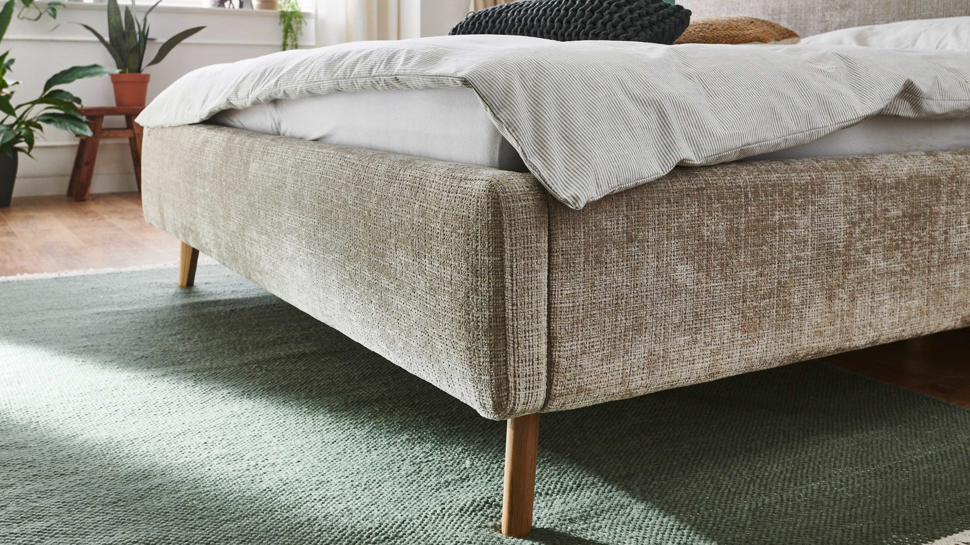 Das Polsterbettgestell Mattis begeistert durch die elegante Optik sowie die hervorragende Material- und Verarbeitungsqualität. Es kombiniert einen beigefarbenen Chenille-Bezug mit eichefarbenen Holzfüßen. Sowohl die Bettseiten als auch das Polsterkopfteil sind glatt bezogen. Letzteres lädt Sie ein, sich anzulehnen, wenn Sie abends im Bett vor dem Schlafen noch fernsehen oder in einem Buch lesen.