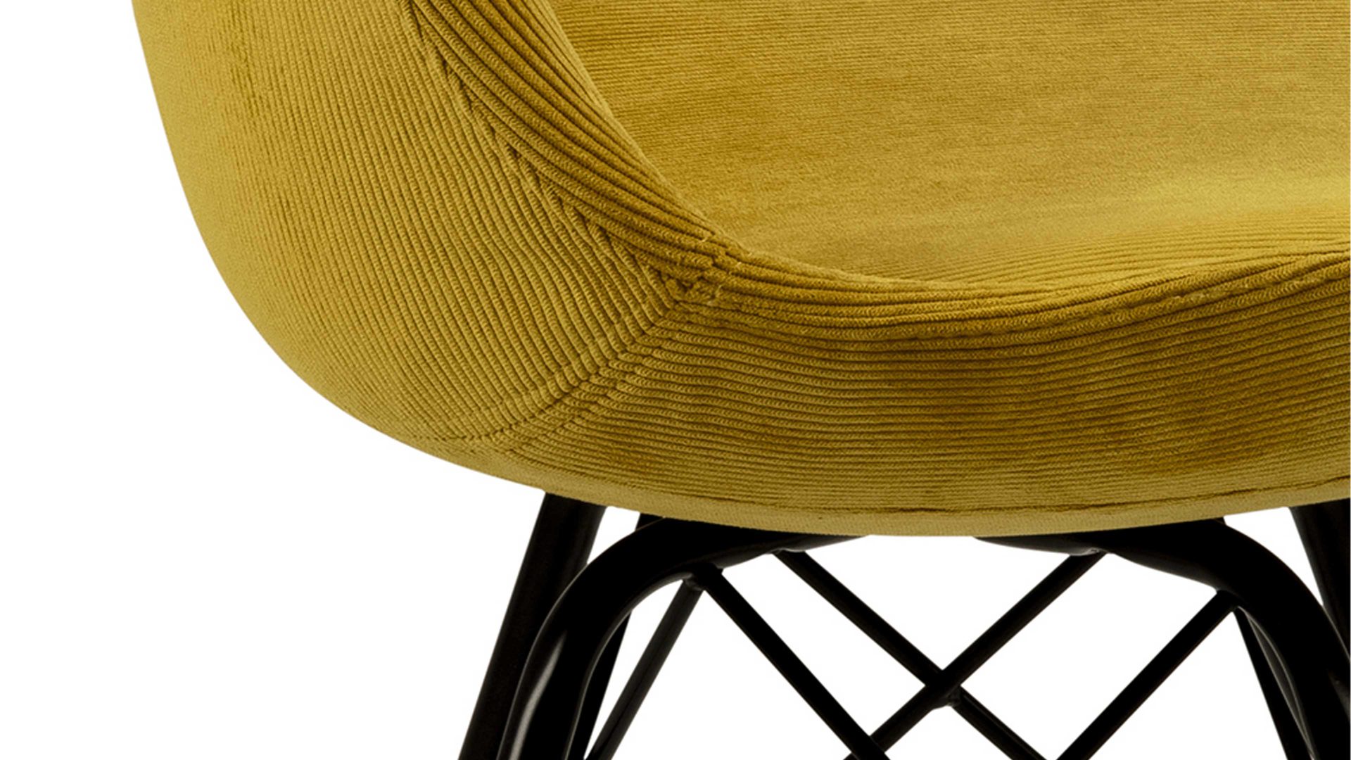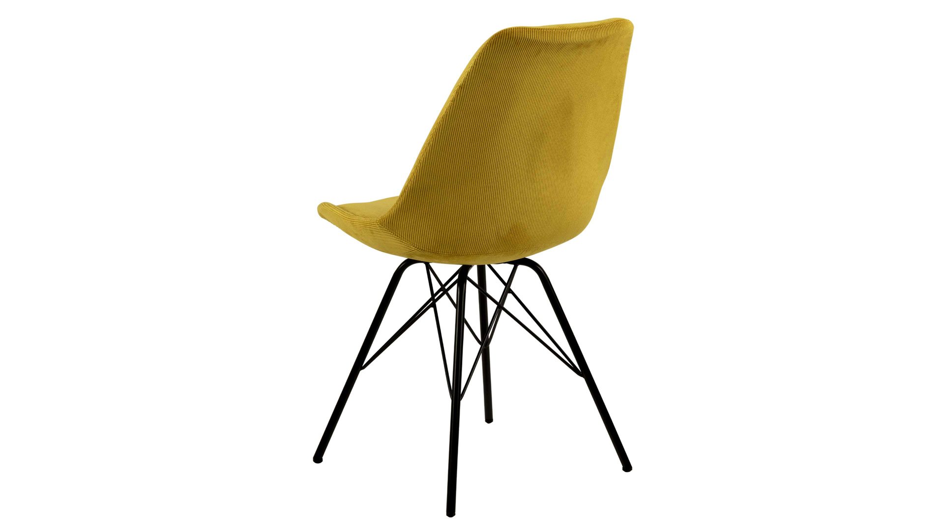 Dieser Polsterstuhl verkörpert klassische Eleganz. Als stabile, dabei aber wunderbar filigran designte Basis fungiert ein mattschwarz pulverbeschichtetes Stahldrahtgestell. Darauf befindet sich eine gelbe Sitzschale aus robustem Kunststoff. Sie ist rundherum mit Feincord bezogen, ebenfalls in warmem Gelb. Der angesagte Feincordbezug überzeugt sowohl qualitativ als auch optisch und haptisch.