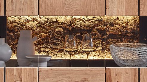 gebürstete massive, biancofarbene Wildeiche-Fronten, kombiniert mit Echtkork und tiefschwarz pulverbeschichtetem Aluminium