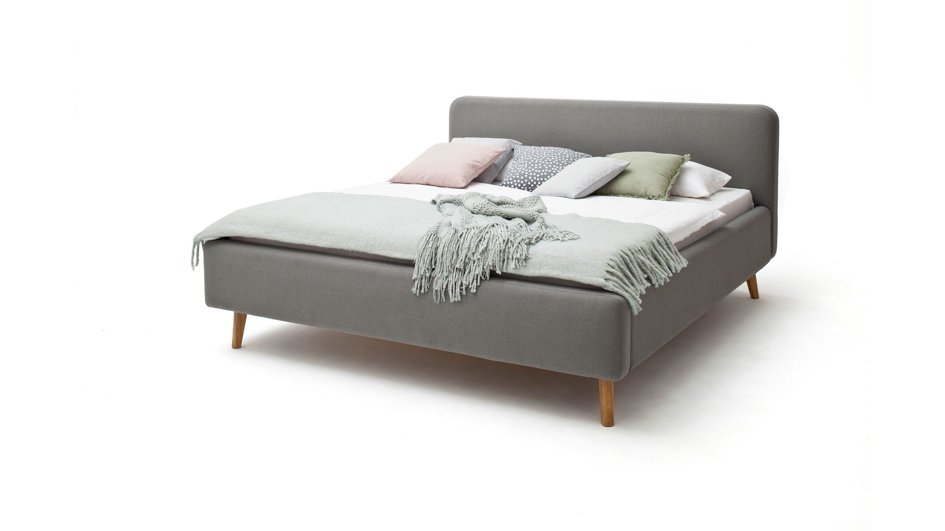 Das Polsterbettgestell Mattis begeistert durch die elegante Optik sowie die hervorragende Material- und Verarbeitungsqualität. Es kombiniert einen hellgrauen Flachgewebe-Bezug mit eichefarbenen Holzfüßen. Sowohl die Bettseiten als auch das Polsterkopfteil sind glatt bezogen. Letzteres lädt Sie ein, sich anzulehnen, wenn Sie abends im Bett vor dem Schlafen noch fernsehen oder in einem Buch lesen.