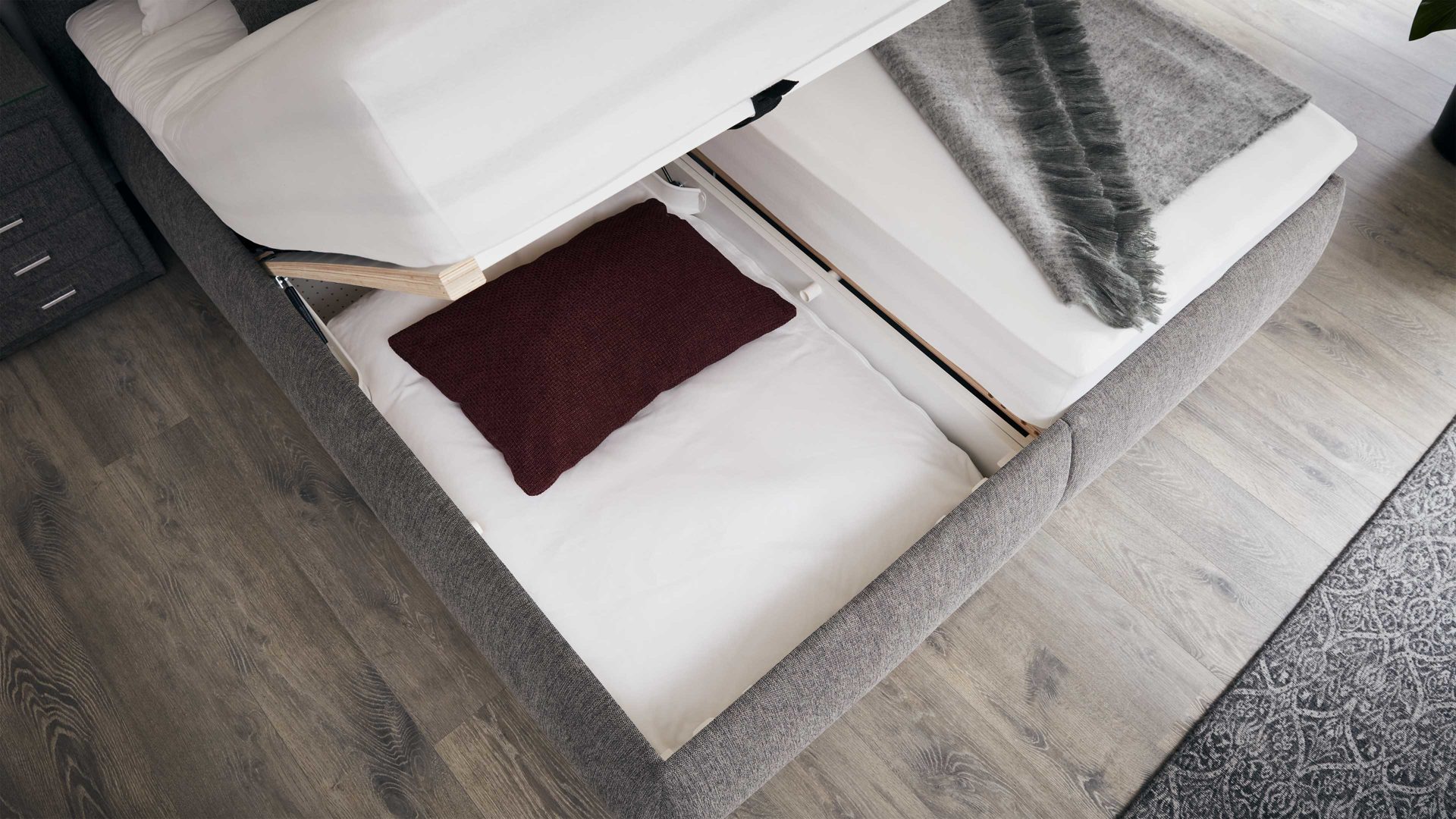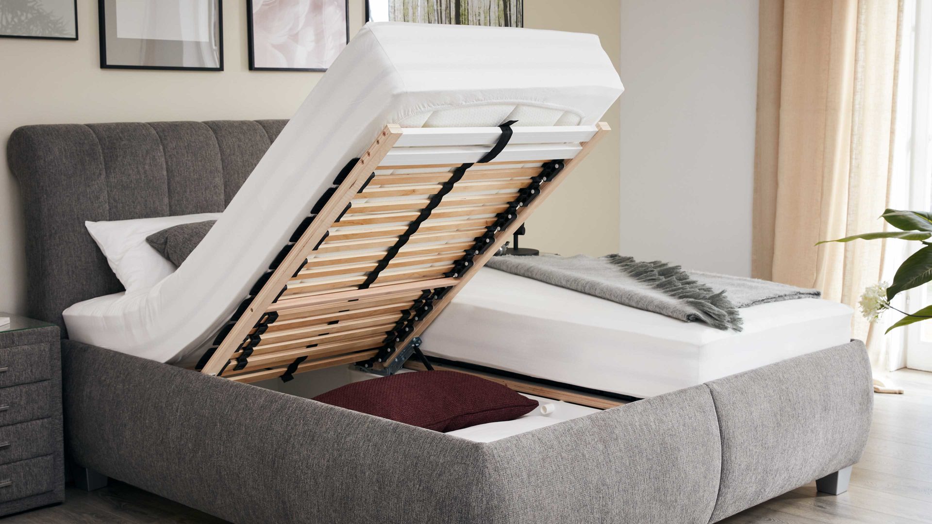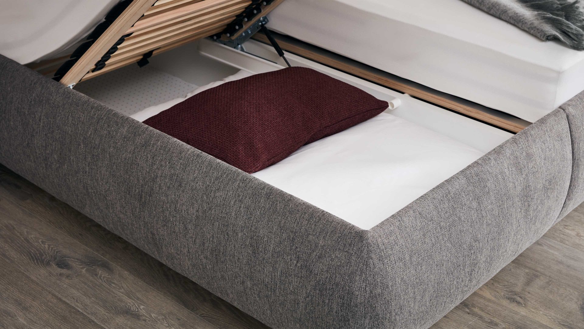 | Verstellbarkeit und Funktion: | Bettkasten aufklappbar Gasdruckfeder abnehmbarer Bezug Kopfteilverstellung manuell verstellbar | |