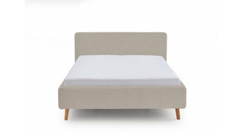 Mit den eichefarbenen Holzfüßen und dem beigefarbenen Boucle-Bezug bringt das Polsterbettgestell Mattis maritimes Flair in Ihr Schlafzimmer.