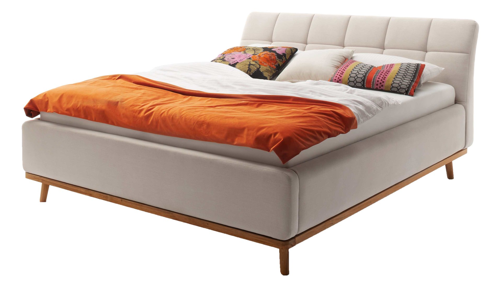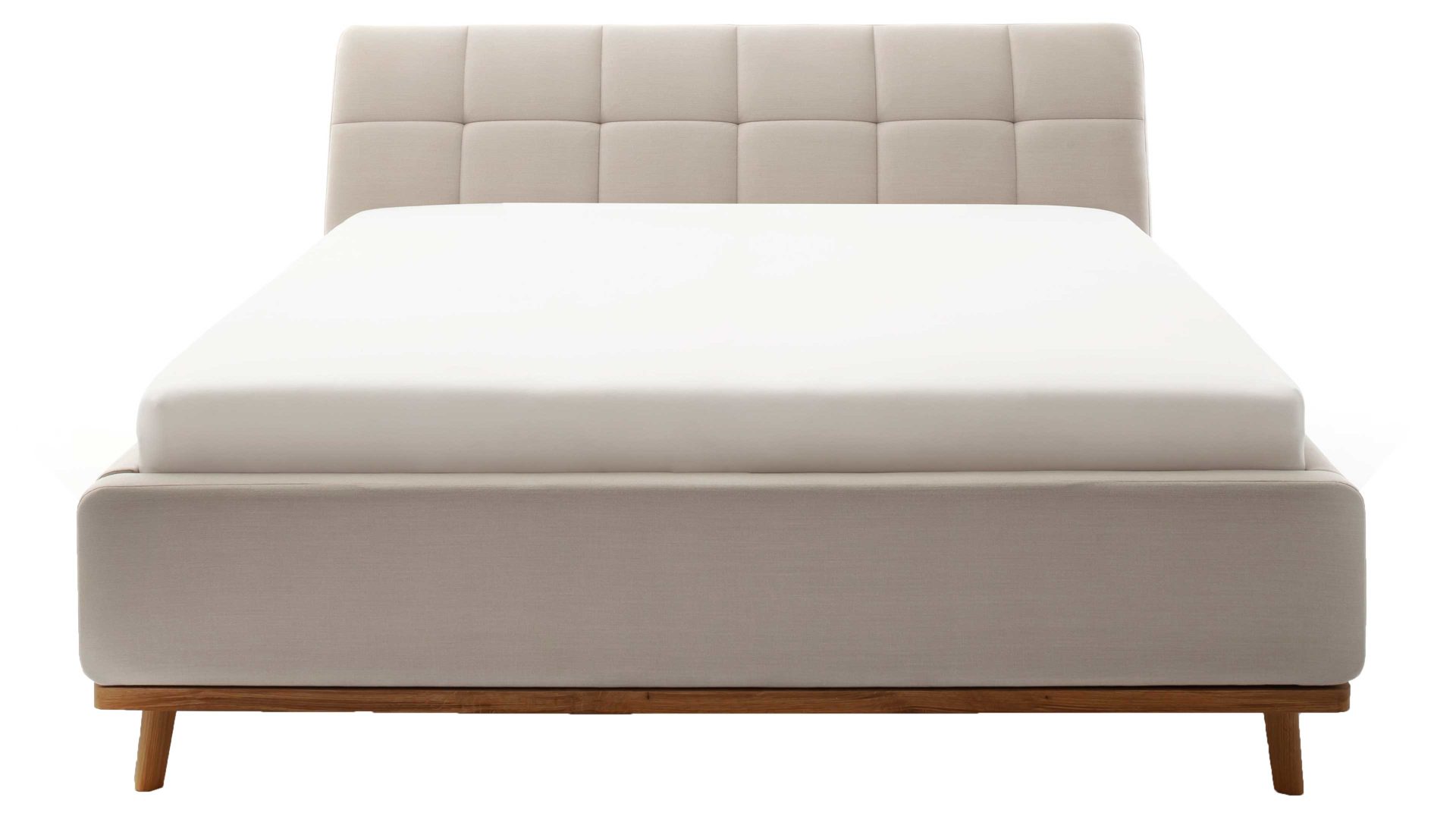 Pure Eleganz bringt das Polsterbettgestell Mila in Ihr Schlafzimmer. Es ruht auf einem eichefarbenen, massiven Holzrahmen. Die ebenfalls eichefarbenen Füße wirken filigran und verleihen diesem Modell eine luftig leichte Ausstrahlung. Ausgestattet ist das schicke Bett mit dem Bezug Capri 3723 aus beigem Flachgewebe.