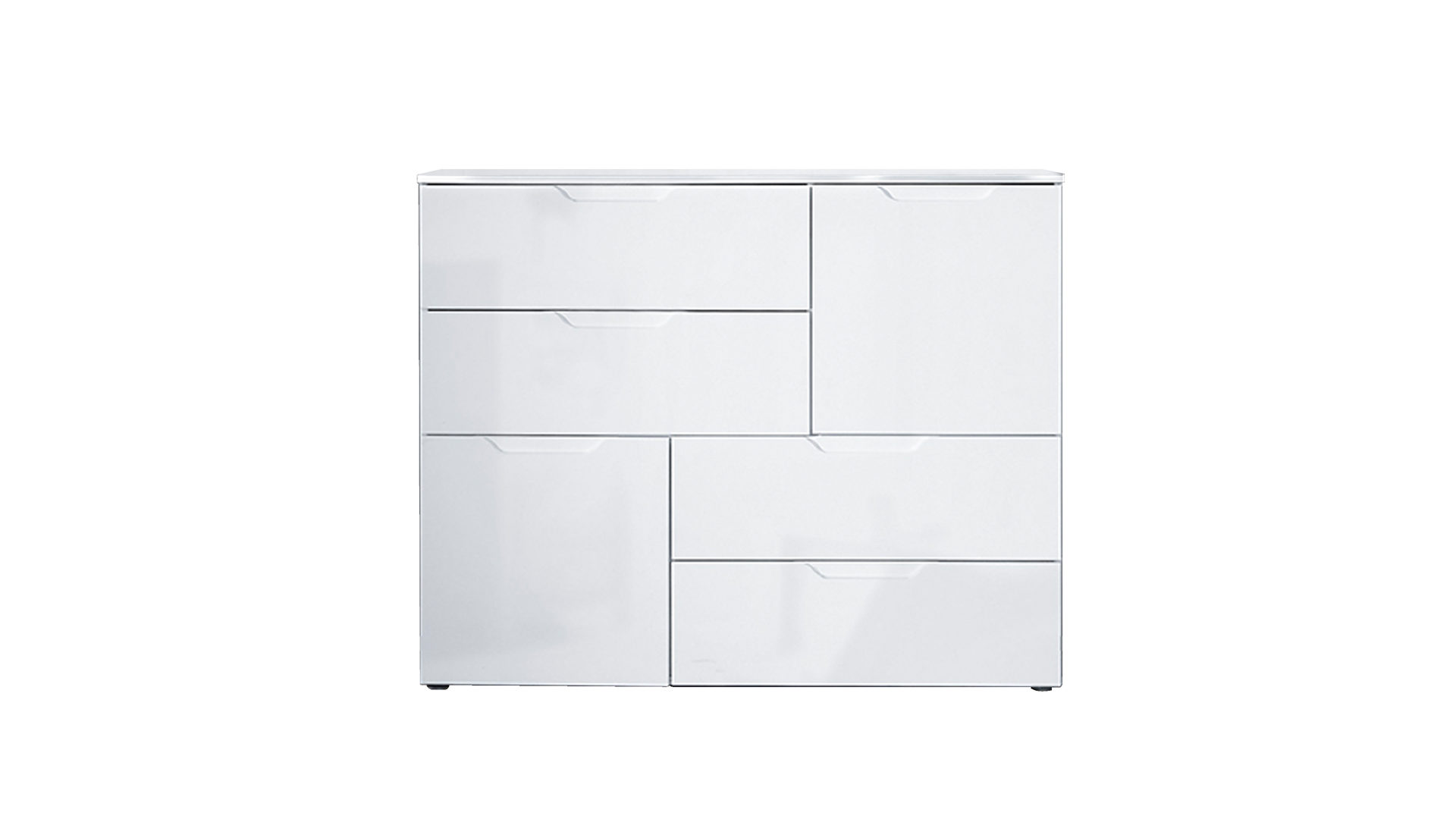 Für Ihre Habseligkeiten in Schlafzimmer und Wohnzimmer eignet sich diese raffinierte Kombikommode ganz hervorragend. Das Schlafzimmermöbel bzw. Wohnzimmermöbel mit weißen Hochglanzfronten und Korpus mit weißen Kunststoffoberflächen ergänzt Ihre Einrichtung im modernen, cleanen Wohnstil und schafft großzügigen Stauraum in Ihrer Wohnlandschaft. Hinter zwei Türen und in vier Schublade finden Sie auf zwei Einlegeböden viel Platz für Besteck, Geschirr und Tischdecken.