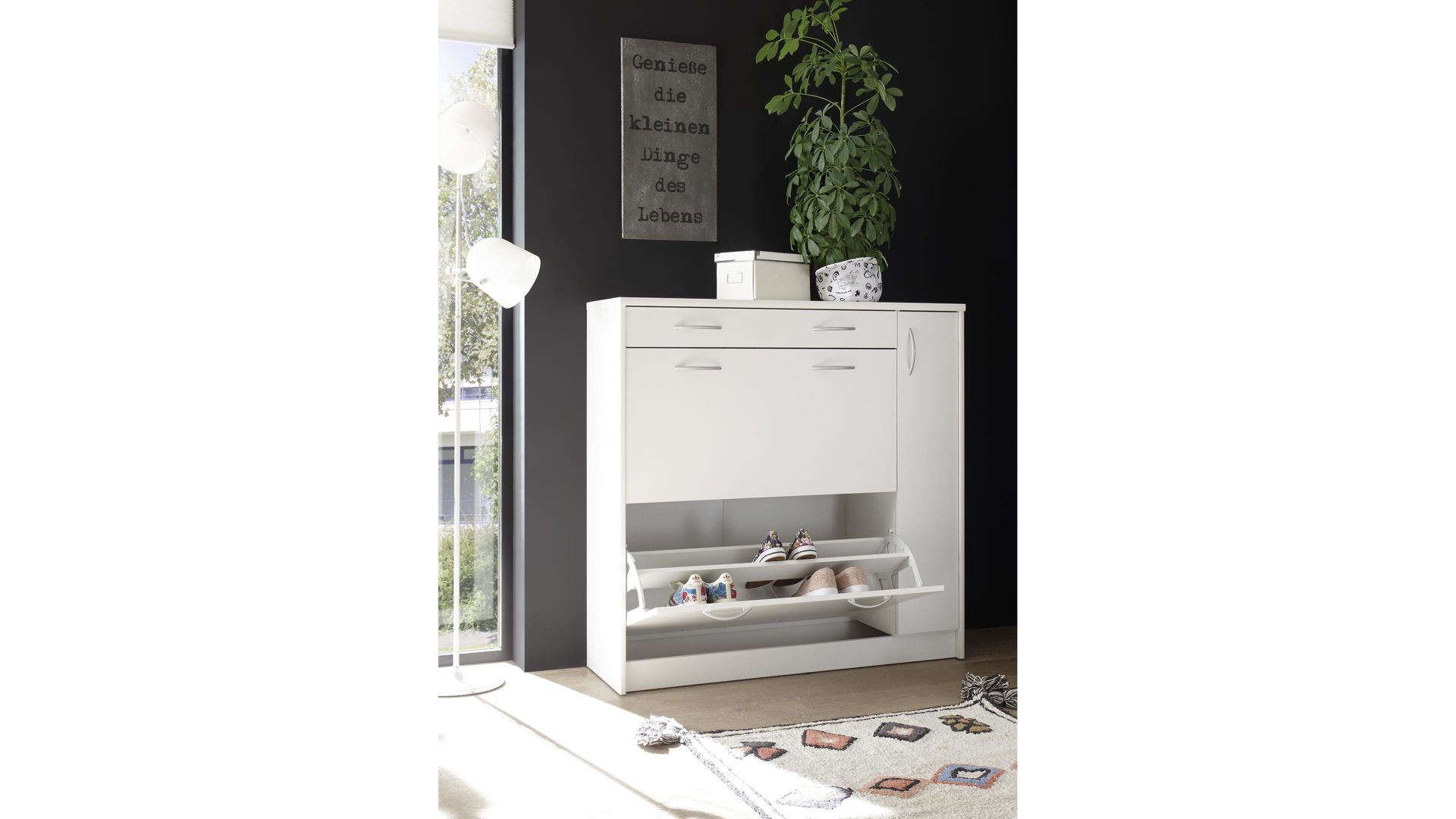 Neben den optischen Vorzügen bieten die Kunststoffoberflächen einen entscheidenden funktionalen Vorteil. Sie sind besonders pflegeleicht, was Ihnen die Reinigung immens erleichtert. Hinter den zwei Klappen der erstklassig verarbeiteten Schuhkommode finden Sie Stauraum für Ihre schönsten Schuhe, die Sie gut geschützt aufbewahren möchten. Überdies beherbergt der Schuhkipper eine Schublade und einen schmalen Türbereich. Diese beiden Elemente verschaffen Ihnen die Möglichkeit, ergänzende Utensilien wie Schuhbürsten, Schuhputzmittel, Schuhlöffel und Ähnliches jederzeit griffbereit zu lagern. Gesamt misst der edle Schuhkipper ca. 108 x 108 x 36 cm (BxHxT).