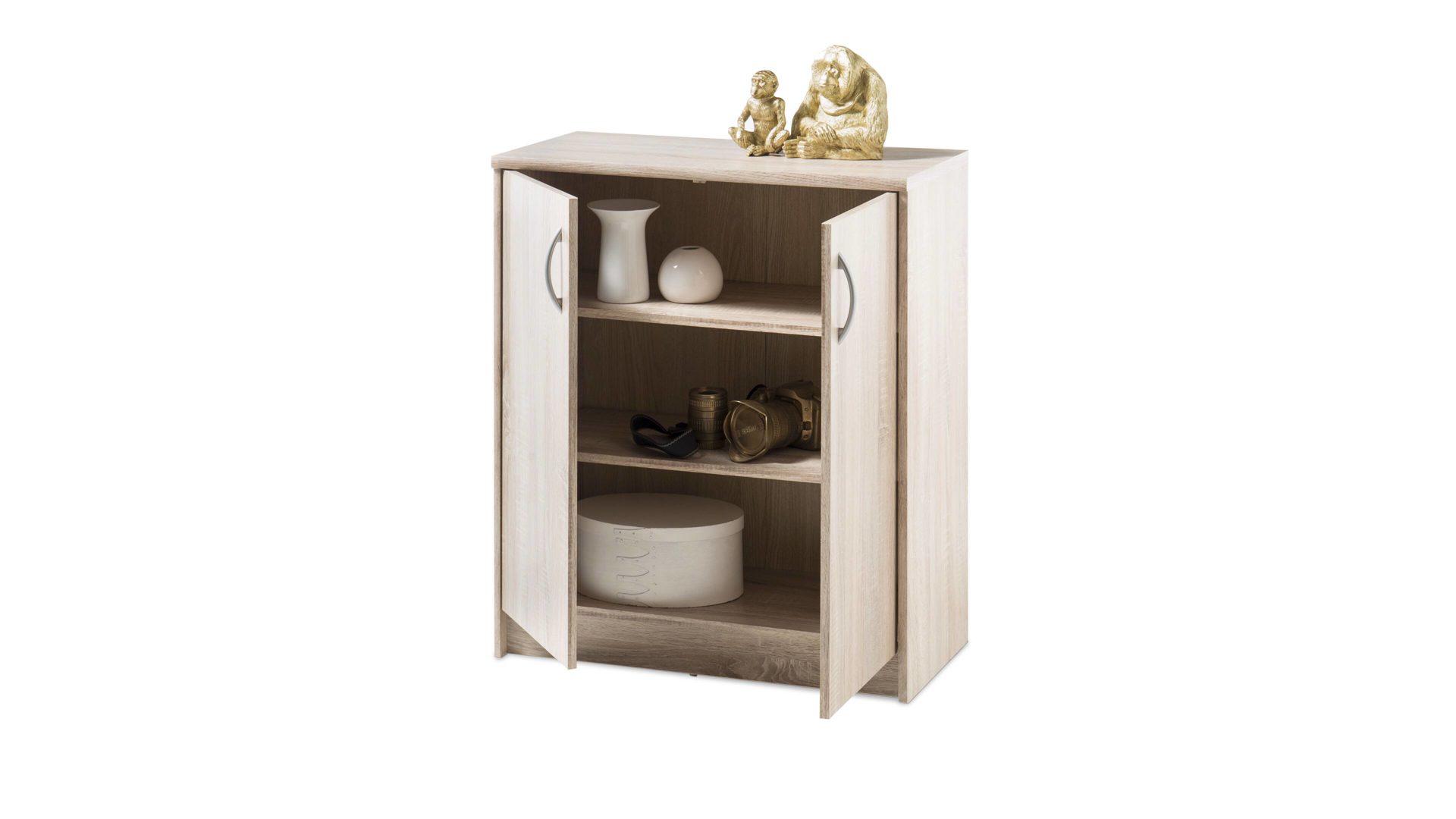 Schaffen Sie Platz und Raum für Ihre Lieblingssachen mit dieser eleganten Türenkommode. Verstauen Sie Ihre Bücher, Ihre CDs oder Ihr Geschirr ordentlich hinter zwei Türen. Schaffen Sie Ordnung mit Hilfe dieses Schranks und nutzen Sie ihn als Flurmöbel, Wohnzimmermöbel, Schlafzimmermöbel oder in Ihrem Ankleidezimmer. Der Kommodenschrank hat dabei zwei Einlegeböden, damit alles seinen Platz findet. Zudem passen die eleganten Sonoma eichefarbenen Kunststoffoberflächen perfekt zu zahlreichen Stilrichtungen.