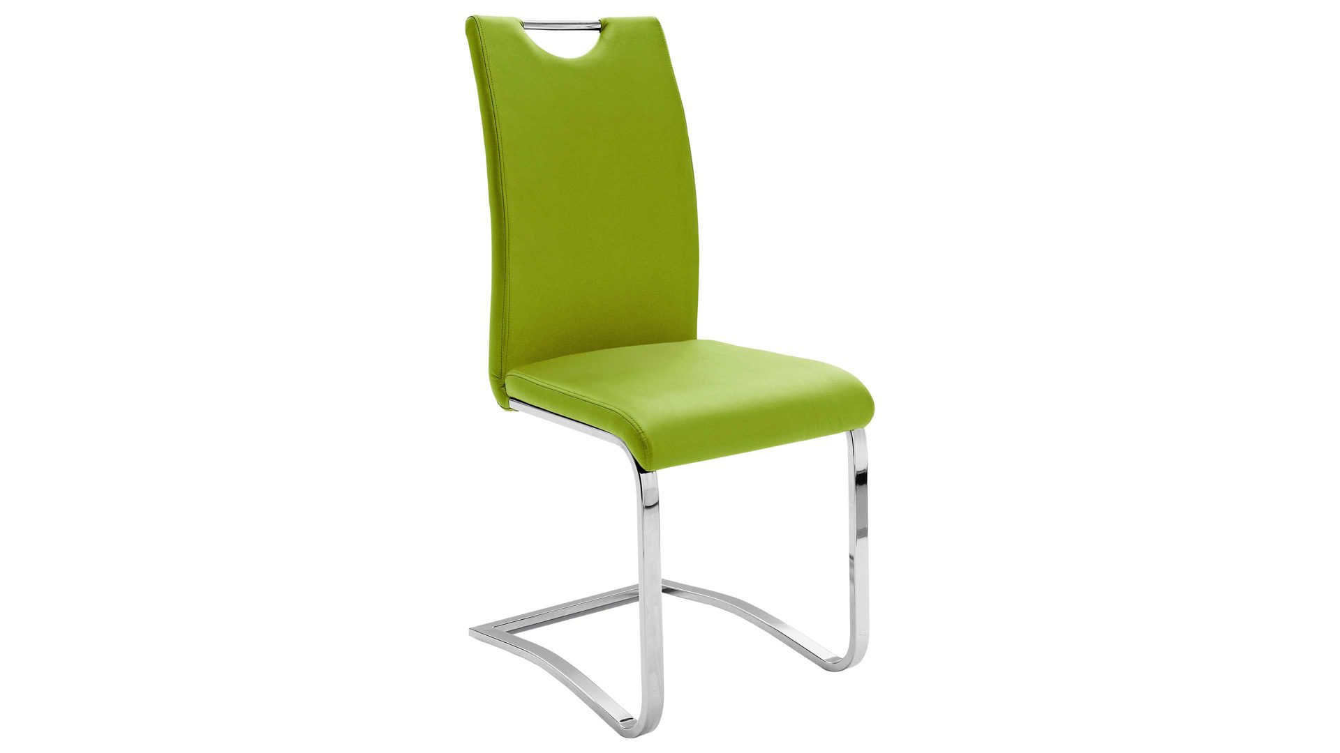 Der komfortable Schwingstuhl für lange Stunden an Ihrem Esstisch ist mit einem limefarbenen Kunstleder bezogen und überzeugt zudem mit einem verchromten Flachrohr-Metallgestell. Dank dieser erstklassigen Materialauswahl setzt der Freischwinger einen modernen Akzent in Ihrem Esszimmer, wo Sie am besten mehrere dieser gepolsterten Sitzmöbel einsetzen.