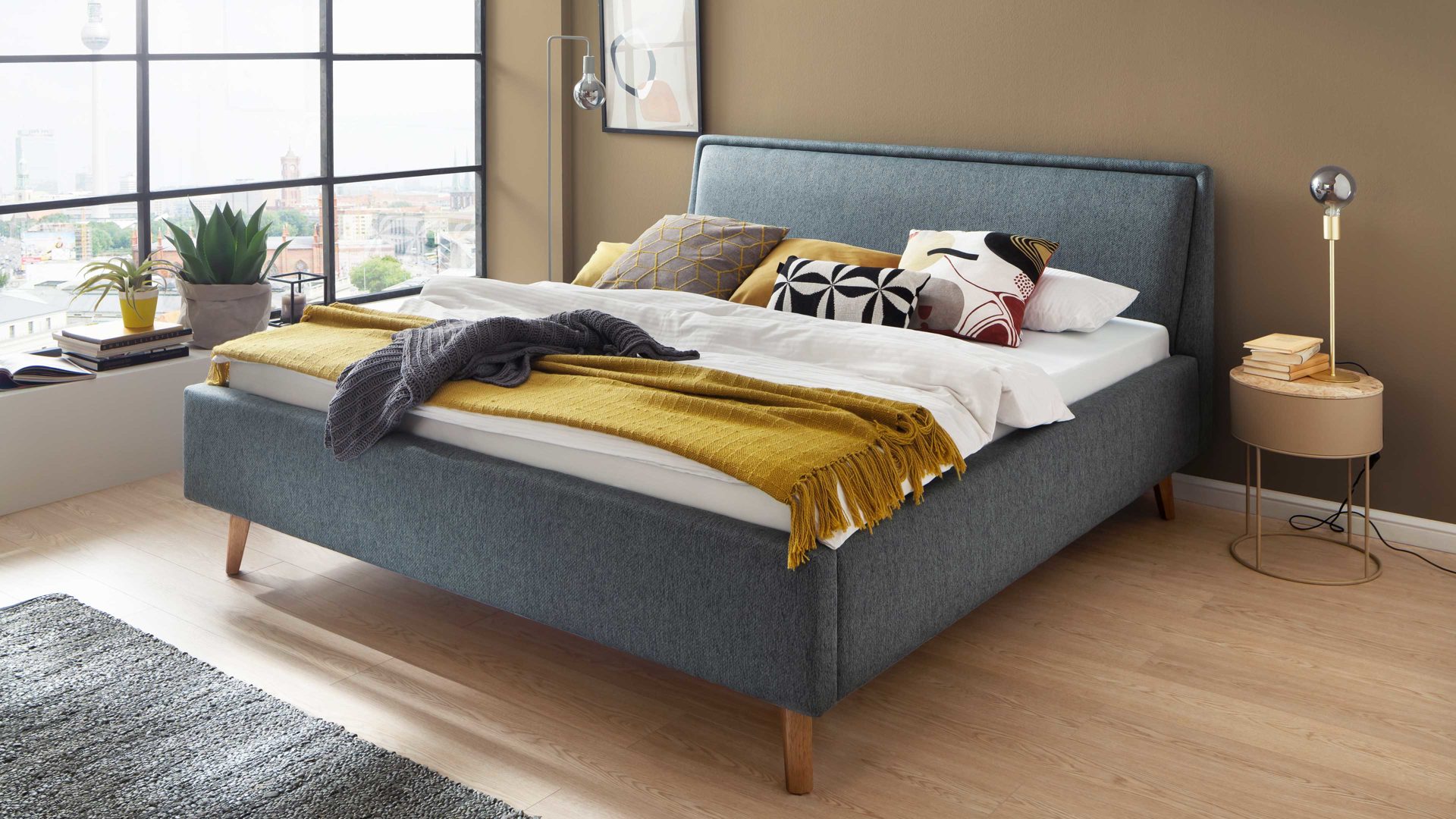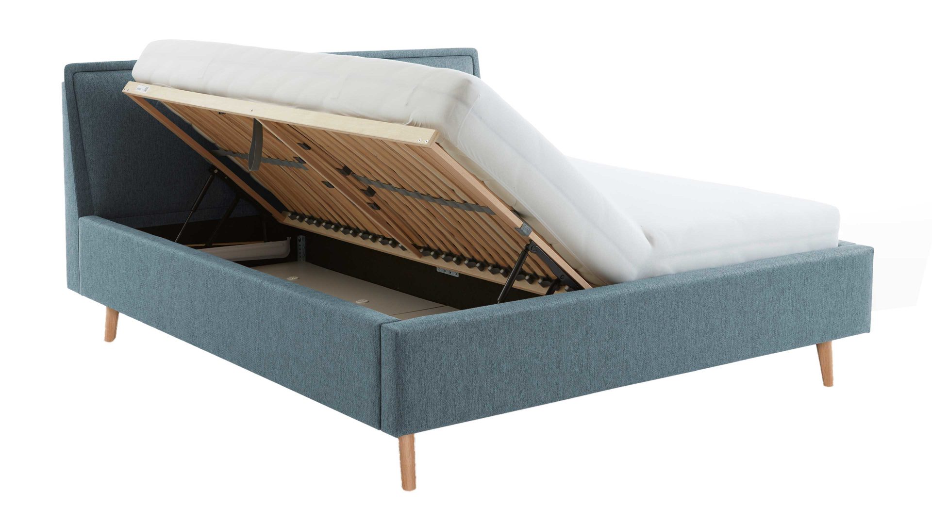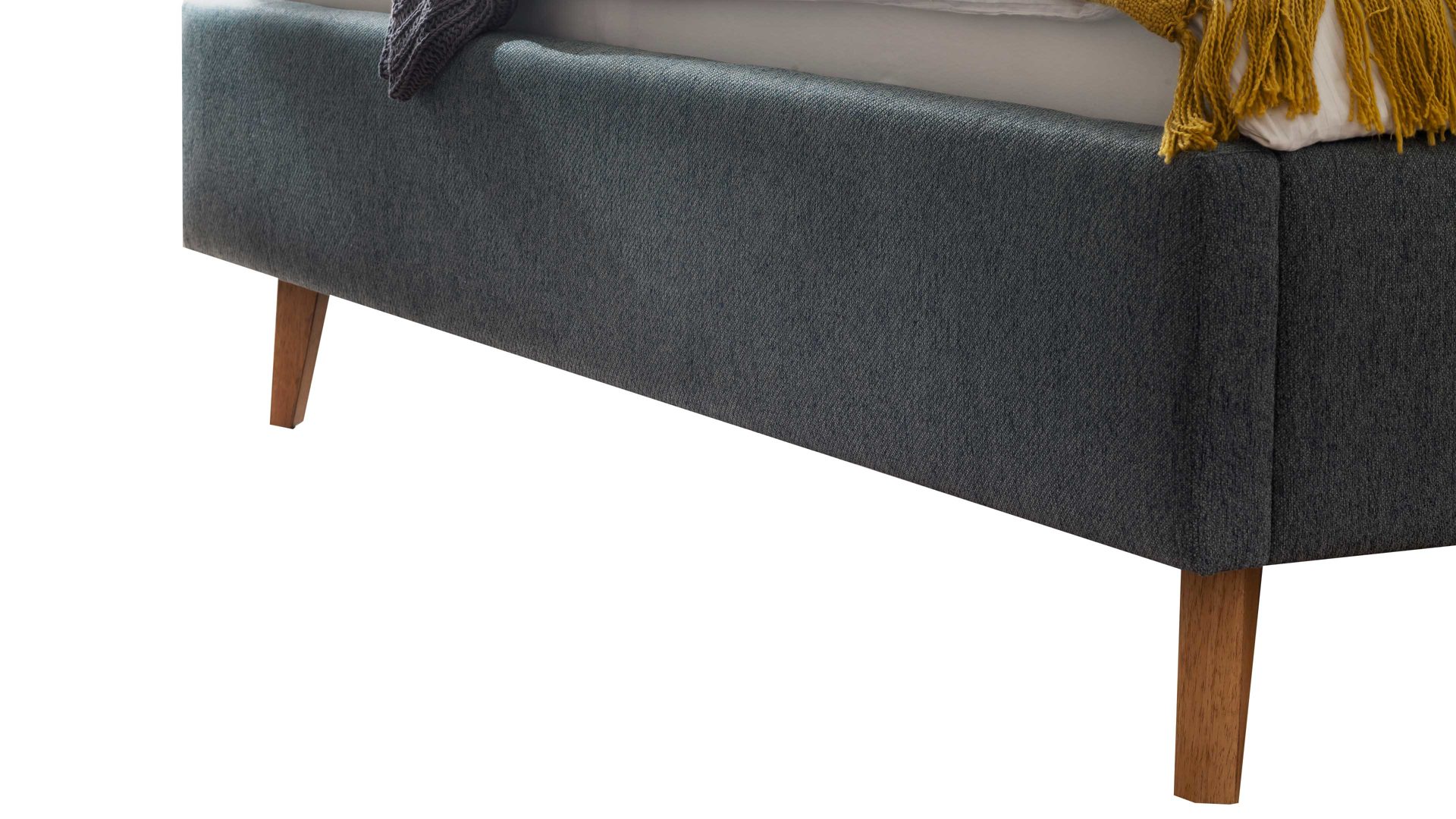 Das Polsterbettgestell Frieda mit Bettkasten verkörpert modernen Komfort. Mit dem oceanfarbenen Stoffbezug und den eichefarbenen Holzfüßen präsentiert es sich elegant und gemütlich designt. Die Bettseiten sind genauso wie das Polsterkopfteil glatt bezogen. Letzteres ist eine angenehm weiche Rückenlehne, wenn Sie abends im Bett vor dem Schlafen noch entspannt in Ihrem Buch lesen oder fernsehen möchten.