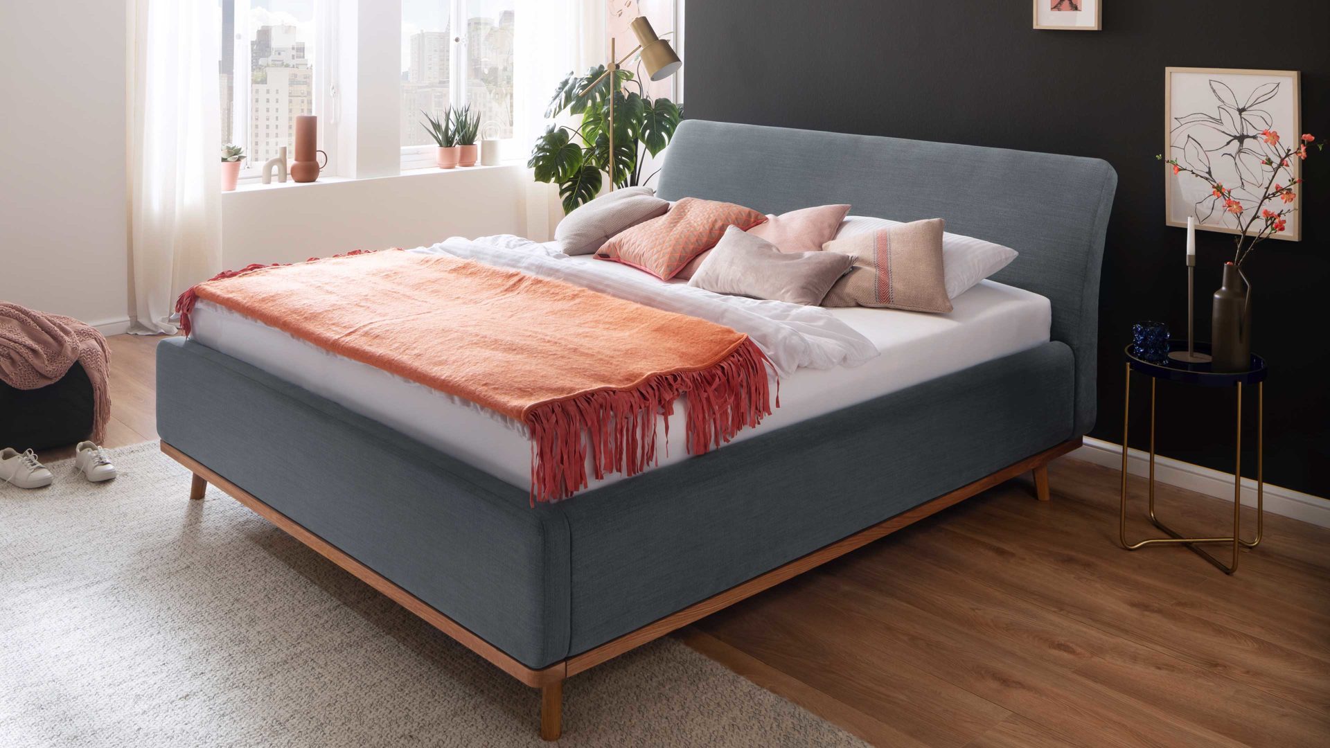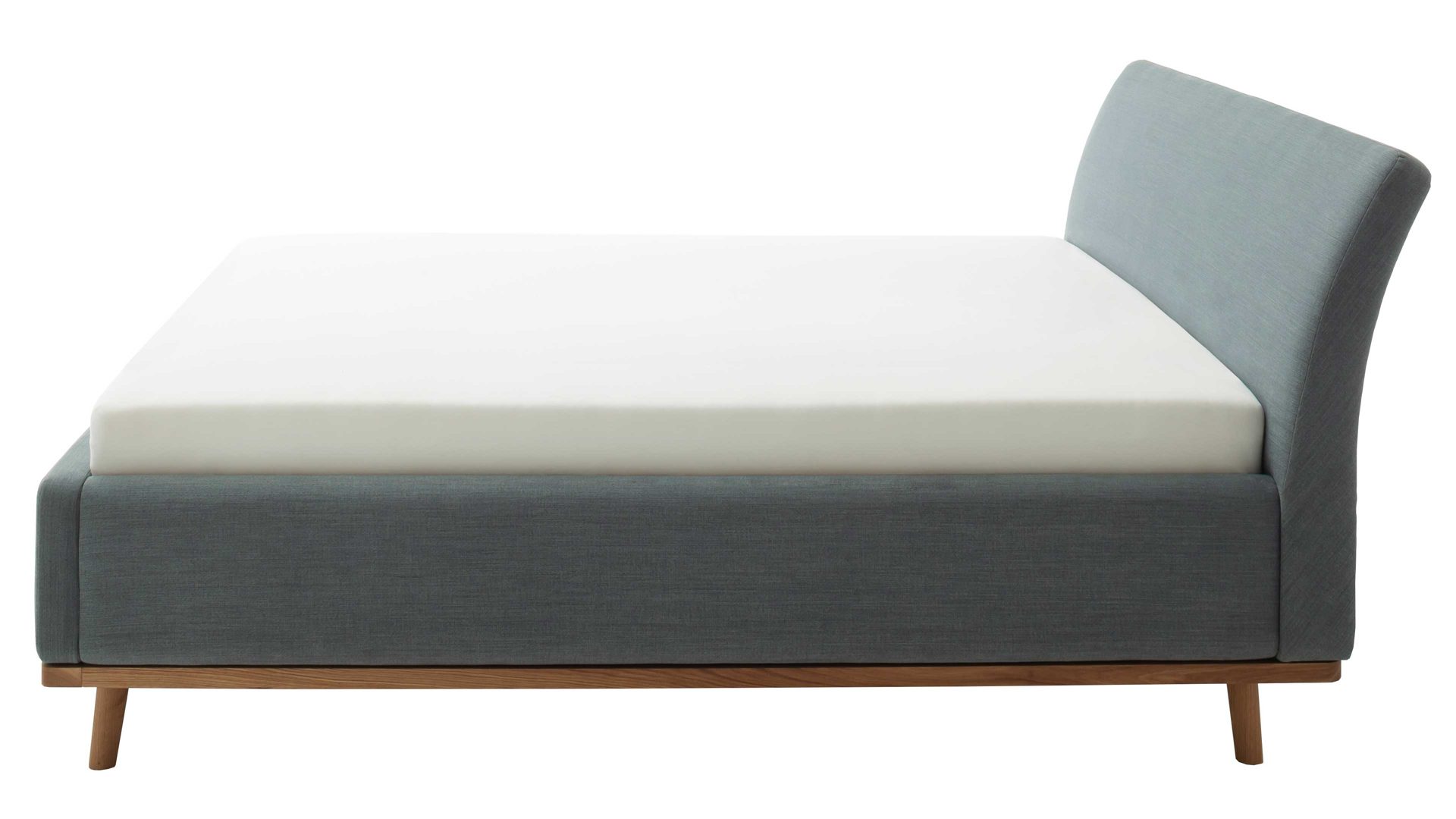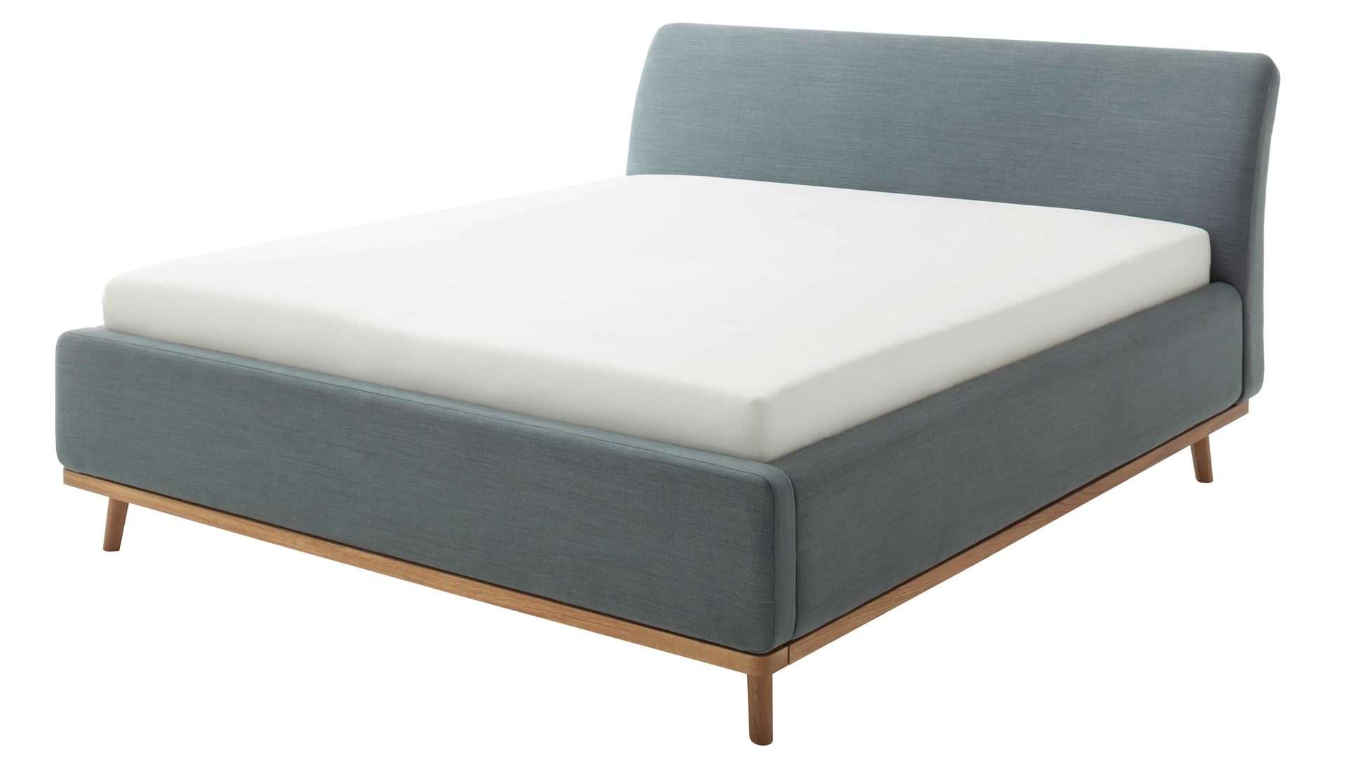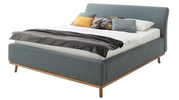 Pure Eleganz bringt das Polsterbettgestell Mila in Ihr Schlafzimmer. Es ruht auf einem eichefarbenen, massiven Holzrahmen. Die ebenfalls eichefarbenen Füße wirken filigran und verleihen diesem Modell eine luftig leichte Ausstrahlung. Ausgestattet ist das schicke Bett mit dem Bezug Capri 7463 aus Flachgewebe in der Farbe Ocean.