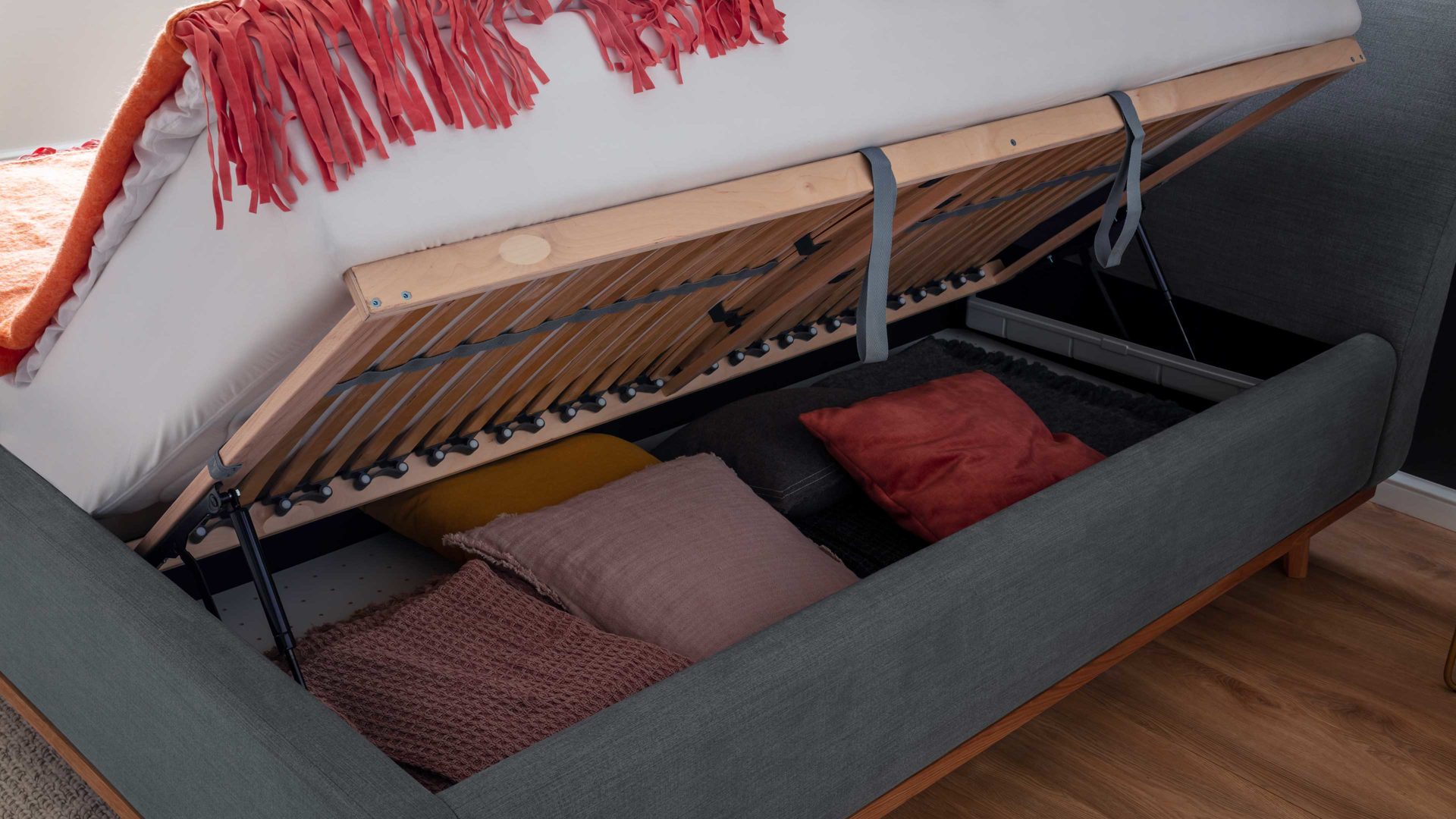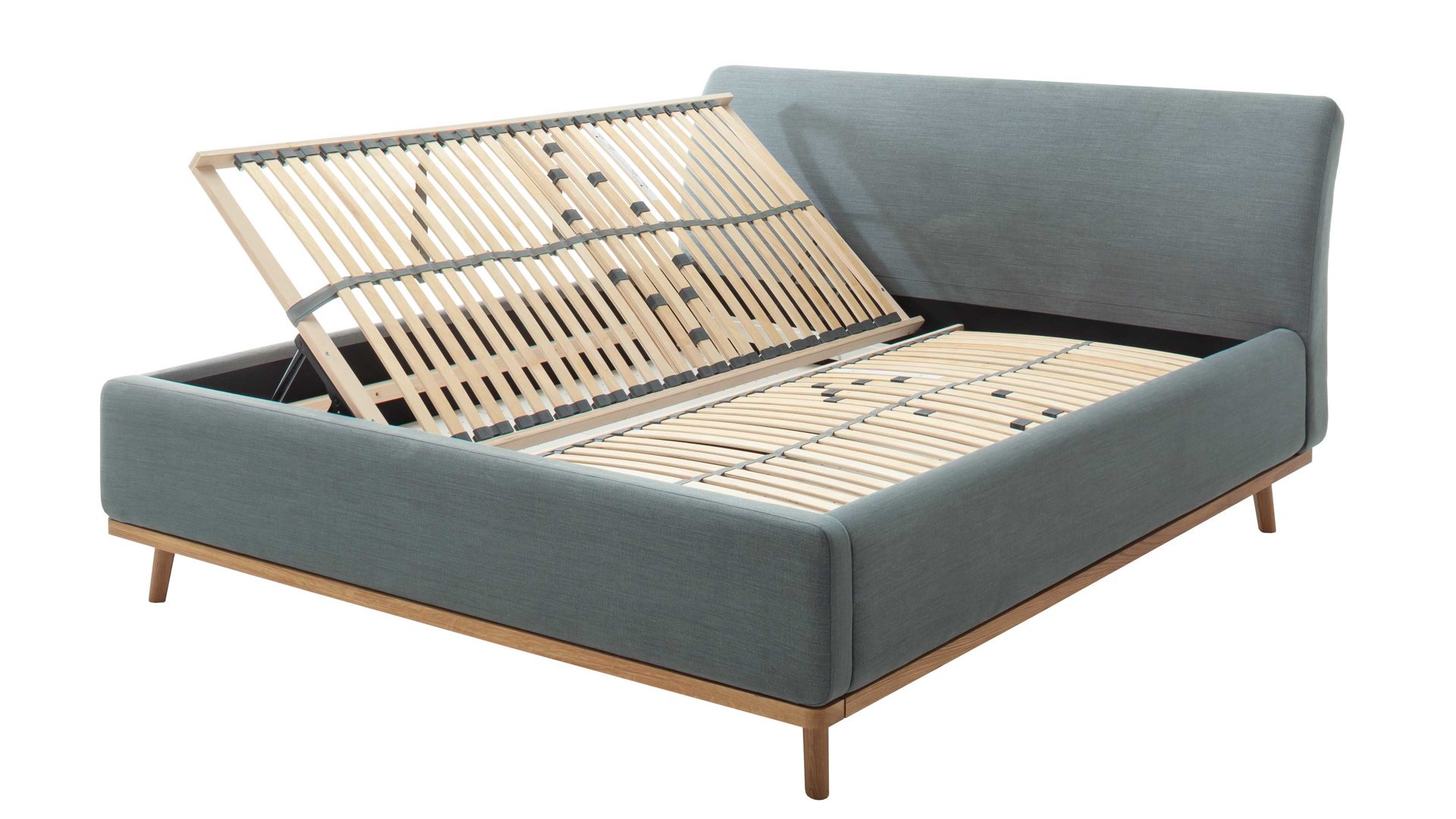 Im Inneren liegen zwei jeweils seitlich zu öffnende Federholzrahmen mit 28 starren Leisten. Dank der möglichen Härtegradverstellung liegen Sie immer genau richtig. Der integrierte Bettkasten ist belüftet und geteilt - für eine Extramaß an Ordnung und Stauraum bei dennoch optimaler Luftzirkulation.