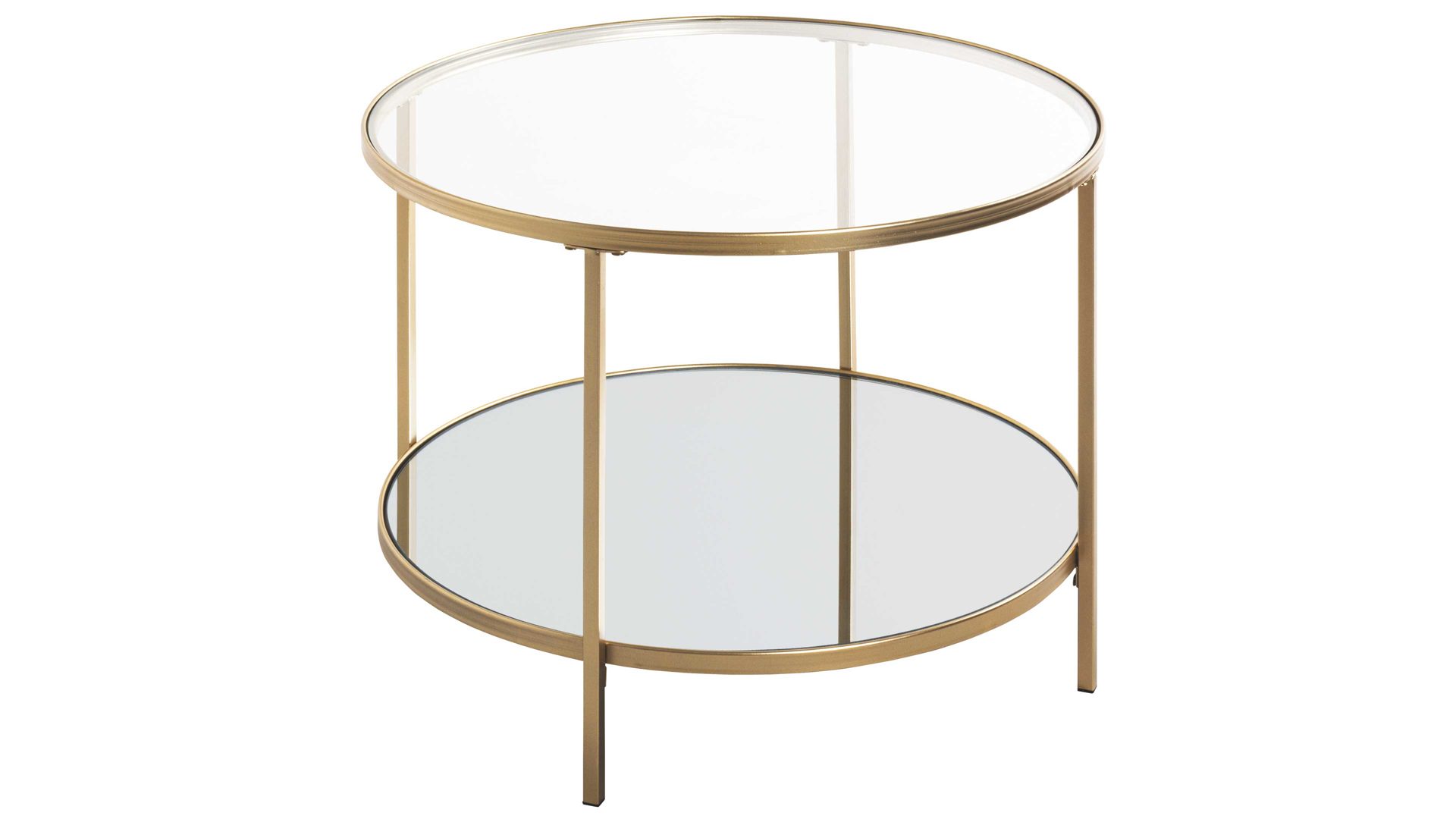 Der Beistelltisch ist mit seinem modernen und eleganten Design ein absoluter Hingucker. Er kombiniert ein goldfarben lackiertes Metallgestell mit zwei Ablagen: Die obere besteht aus Sicherheitsglas und die untere aus Spiegelglas. Dank der hochwertigen Materialien ist das Tischchen robust, widerstandsfähig und langlebig. Seine Maße belaufen sich auf ca. 45 x 60 cm (HxD).