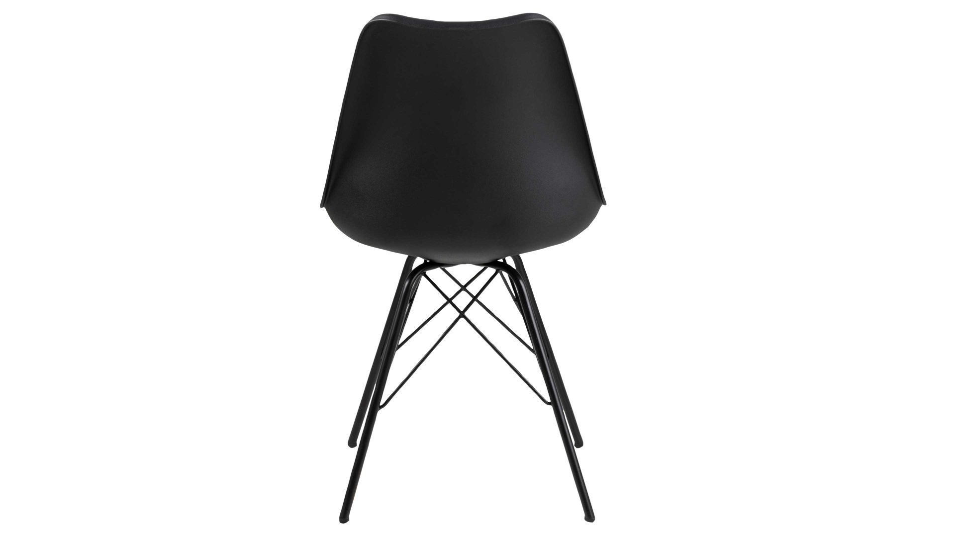 Dieser Polsterstuhl verkörpert schlichte Eleganz. Seine stabile, dabei aber wunderbar filigran designte Basis bildet ein mattschwarz pulverbeschichtetes Stahldrahtgestell. Darauf befindet sich eine schwarze Sitzschale aus robustem Kunststoff. Sie ist mit schwarzem Kunstleder bezogen, das sowohl qualitativ als auch optisch und haptisch überzeugt. Die Farbgebung sorgt für eine klassische Ausstrahlung.