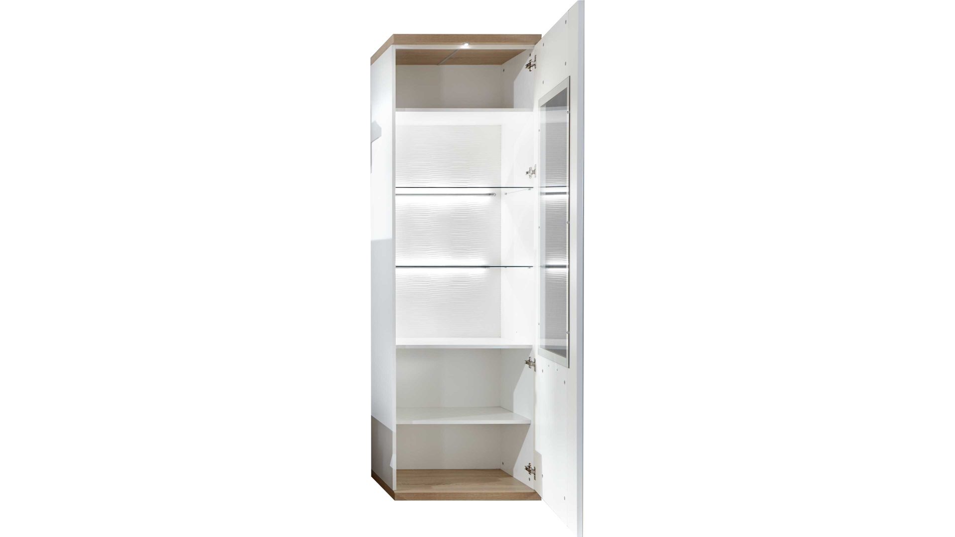Tolle Vitrine für Ihr Zuhause: Mit arcticweißer Hochglanzfront und Eiche sägerau geschroppten Absetzungen besticht diese raffinierte Stauraumlösung als Wohnmöbel. Der Korpus verfügt über arcticweiße Melaminoberflächen, die nicht nur stoß- und kratzfest, sondern auch lichtbeständig sind. Der Vitrinenschrank, dessen Tür einen Glaseinsatz hat, ist bereits mit Front-LED-Beleuchtung ausgestattet. Bitte beachten Sie, dass für die Glasbodenbeleuchtung ein Mehrpreis berechnet wird. In diesem Aufbewahrungsmöbel bringen Sie Gläser, Vasen, Bücher und Wohnaccessoires ordentlich und staubfrei unter.