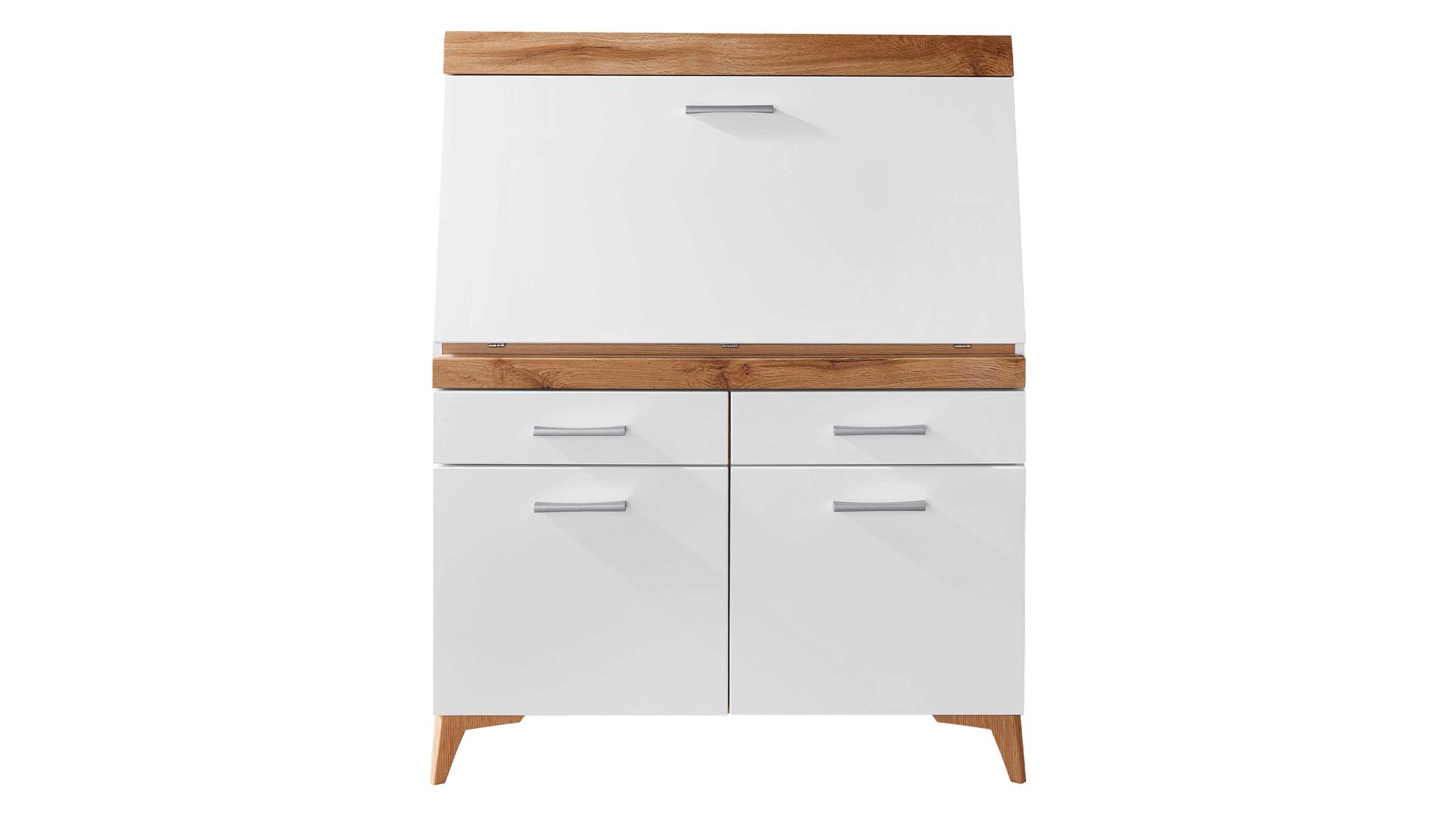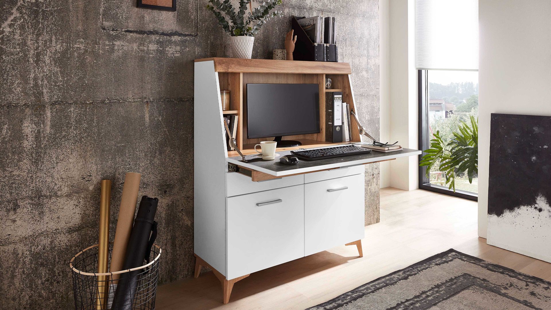 Darüber hinaus beherbergt der Sekretär zwei Schubladen mit praktischem Kugelvollauszug und zwei Türen mit Soft-Close für lautloses Schließen und jeweils einem Holzboden. Hier können Sie weitere Gegenstände, die Sie im Arbeitsalltag benötigen, licht- und staubgeschützt aufbewahren. Die Maße des hochwertigen Schreibschranks belaufen sich auf ca. 98 x 124 x 42 cm (BxHxT). Er kombiniert puristisch mattweiße Oberflächen mit stilvoller Eiche Altholz-Nachbildung und silberfarbenen Griffen. Alternativ steht der modern designte Sekretär Secret noch in einer zweiten Farbvariante zur Wahl.