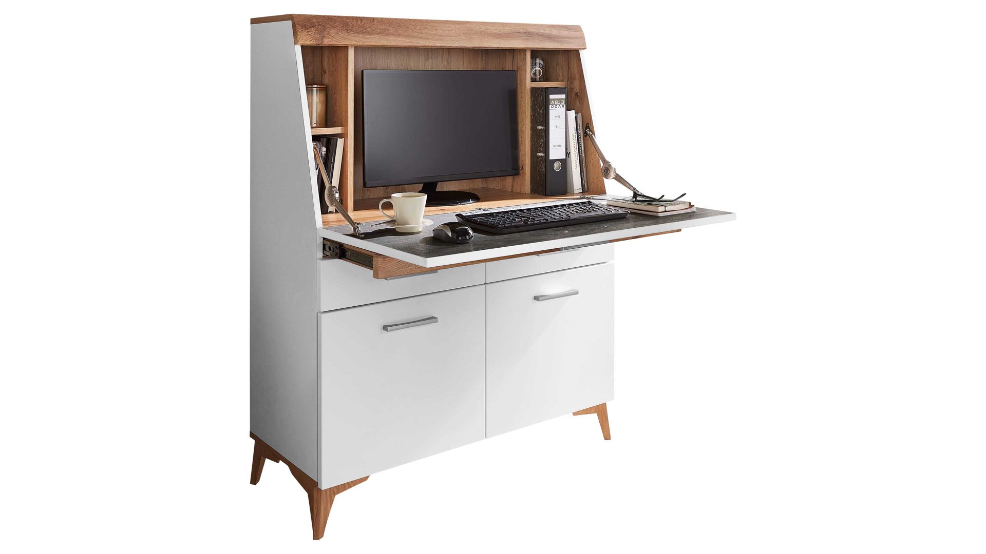 Der Sekretär Secret macht seinem Namen alle Ehre. Geheimnisvoll verbirgt er eine Schreibplatte, die durch das Öffnen der Klapptür oben zum Vorschein kommt. Alternativ kann der Schreibschrank jedoch auch schlicht als reine Hochkommode genutzt werden - einfach immer so, wie Sie das Wohnmöbel gerade brauchen. Hinter der Klapptür befinden sich mehrere Fächer, die Ihnen jede Menge Stauraum für Schreibutensilien, Unterlagen und andere Utensilien bieten. Der mittlere Bereich, dessen Maße ca. 59 x 42 x 20 cm (BxHxT) betragen, ist als Nische für einen PC-Monitor vorgesehen.