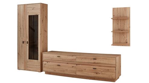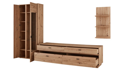 | Maße Einzelartikel: | Vitrine ca. 88,6 x 206 x 37,2 cm (BxHxT) Wandboard ca. 45 x 100,4 x 23,2 cm (B/LxHxT) Lowboard ca. 210 x 62,3 x 50 cm (B/LxHxT) | |