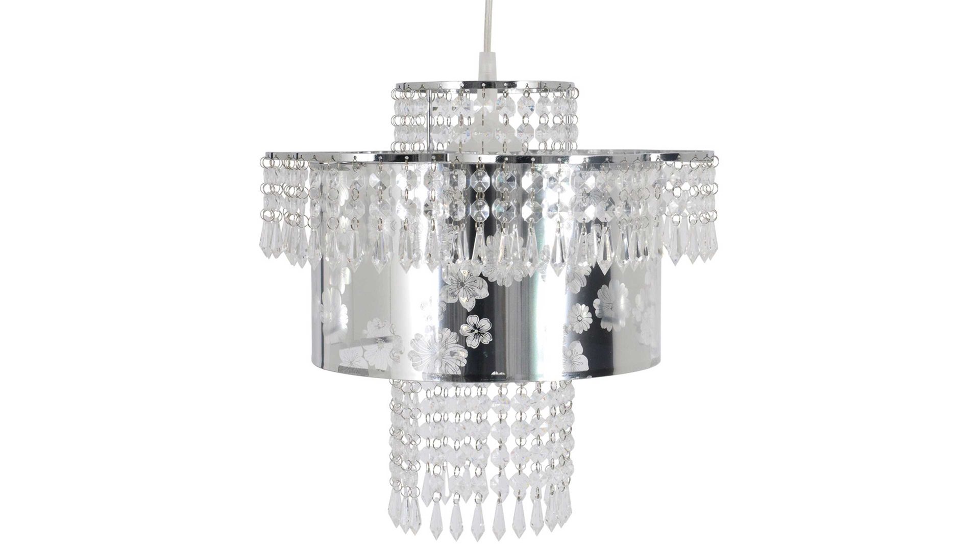 Sie offenbart einen chromfarbenen Metall-Lampenschirm mit floralem Muster und ein Gehänge aus Acrylglas, das zweifelsohne als optisches Highlight fungiert. Alles in allem präsentiert sich die Hängelampe außergewöhnlich komponiert. Durch die ausgeprägte Eleganz setzt sie in jedem Raum einen noblen Akzent.
