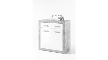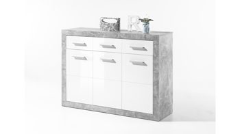 Die stilvoll designte Schubladenkommode Stone vereint in sich die Kreativität der Beton-Nachbildung mit der Eleganz weißer Hochglanzoberflächen. Aus dieser sehr gelungenen Farbkombination ergibt sich ein ansprechender Schrank, der sich für die verschiedensten Räumlichkeiten ideal eignet. Abgerundet wird die Kommode durch die chromfarbenen Griffe, die sich perfekt ins Gesamtbild einfügen.