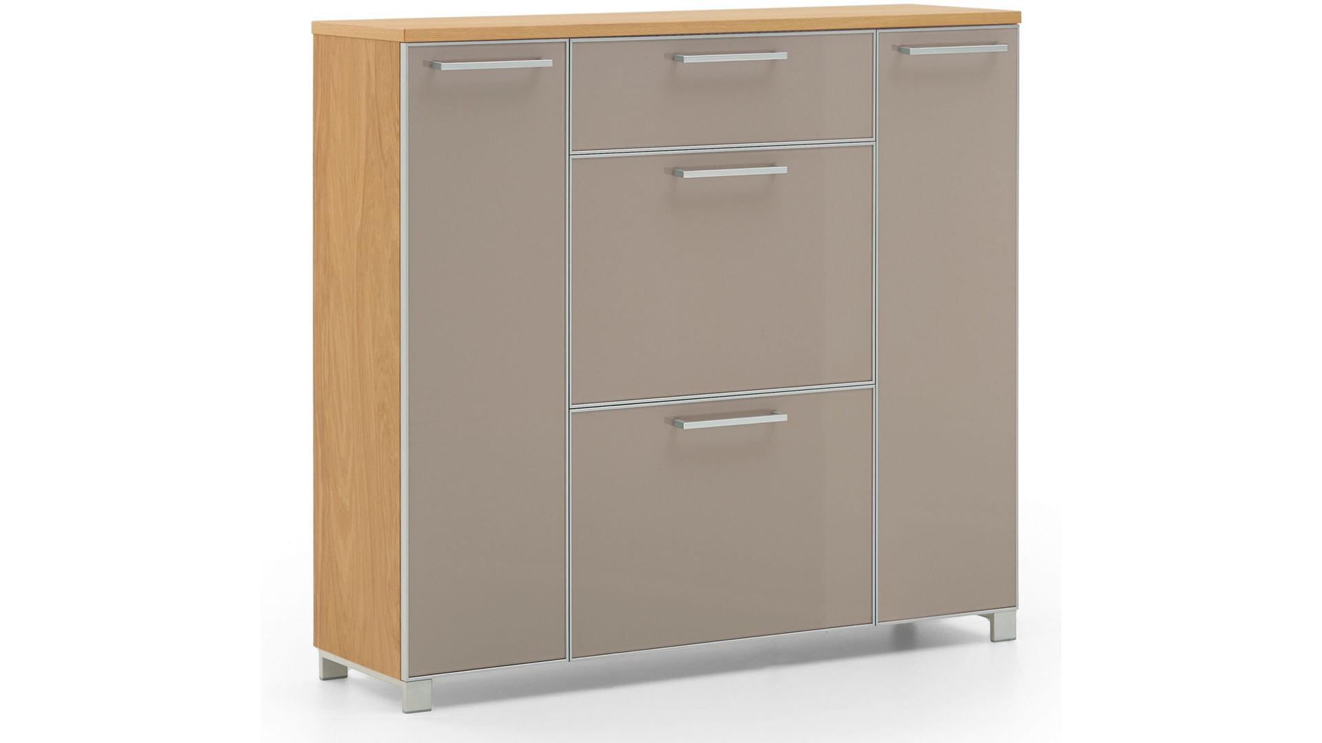 Durch die gelungene Kombination aus taupefarbenem Glas für die Front, Eiche Bianco Furnier für den Korpus und edelstahlfarbenem Metall für die Griffe strahlt der erstklassig verarbeitete Schuhkipper moderne Eleganz gepaart mit natürlichem, warmem Charme aus. Die zwei Türen mit sechs verstellbaren Holzböden im Inneren und die zwei Klappen mit Schuhkörben bieten Ihnen Stauraum für insgesamt ca. 20 Paar Schuhe. Überdies beherbergt die Schuhkommode eine Schublade mit Vollauszug. Darin können Sie beispielsweise Schuhlöffel und Schuhcreme aufbewahren. Die Maße des praktischen Schuhschranks belaufen sich auf ca. 121 x 108 x 31 cm (BxHxT).