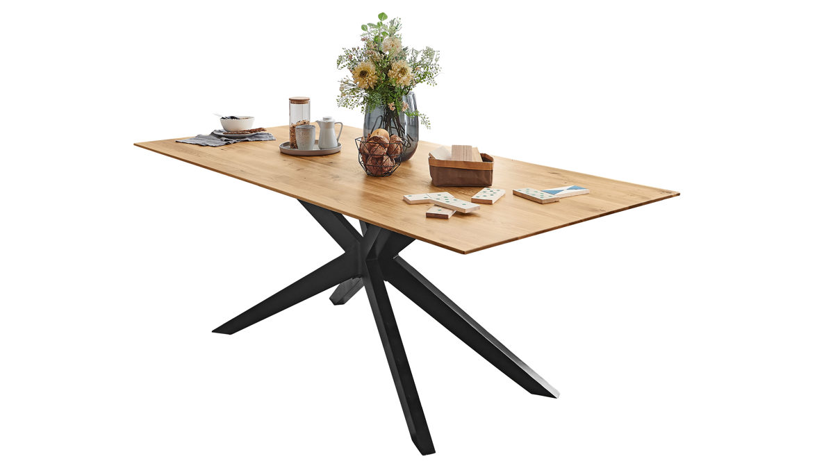 Der NIEHOFF Massivholz-Esstisch Cloudy zeichnet sich durch hohe Qualität sowie moderne Designmerkmale aus. Er kombiniert ein markantes, klassisch mattschwarz lackiertes Sterngestell aus robustem Eisen mit einer Massivholzplatte aus Charakter-Eiche und fügt sich in verschiedene Wohnstile harmonisch ein.