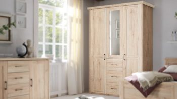 Hinter den insgesamt drei Türen, von denen die beiden äußeren holzfarben gehalten sind und die mittige verspiegelt ist, finden Sie jede Menge Stauraum für Kleidung und sonstige Textilien sowie Accessoires. Links neben der Mittelseite beherbergt der Schrank eine Kleiderstange und zwei Böden, während er rechts vier Böden offenbart. Somit können Sie Ihre Kleidungsstücke nach Bedarf liegend oder hängend aufbewahren. Hinzu kommen drei Schubladen. Sie eignen sich etwa zur Lagerung von Unterwäsche oder Handtüchern. Die Maße des in allen Belangen absolut überzeugenden Kleiderschranks belaufen sich auf ca. 150 x 212 x 62 cm (BxHxT).