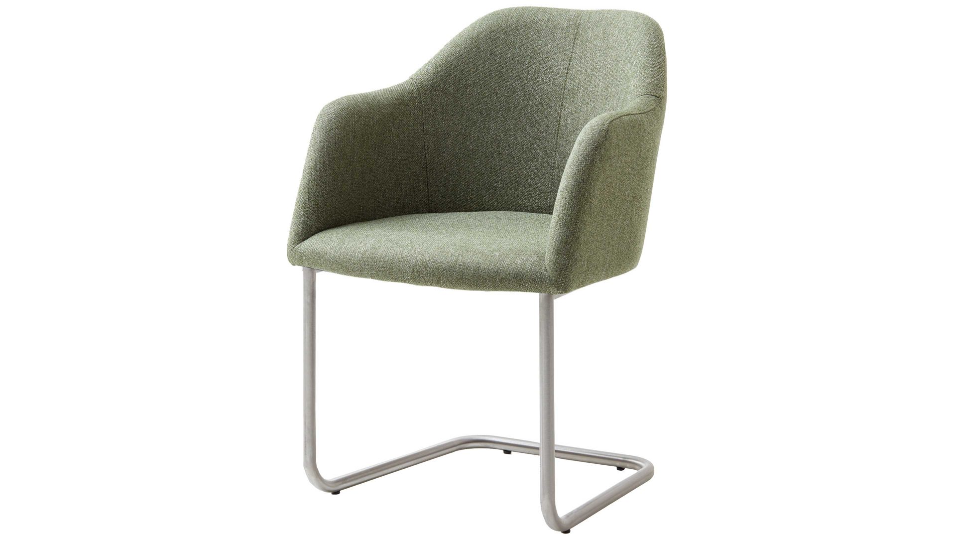 Darüber hinaus weiß er in puncto Komfort zu überzeugen. Ein Edelstahlgestell bildet die robuste Basis. Das widerstandsfähige Material sorgt für die nötige Stabilität und die klassische Farbgebung bringt edles Flair in den Raum. Attraktiv abgerundet wird der Schwingstuhl durch den blassgrünen Webstoffbezug. Die außergewöhnliche Farbe wirkt elegant und harmoniert bestens mit dem Gestell. Einen feinen Akzent setzt die Steppnaht im Rücken des Schalensitzes.