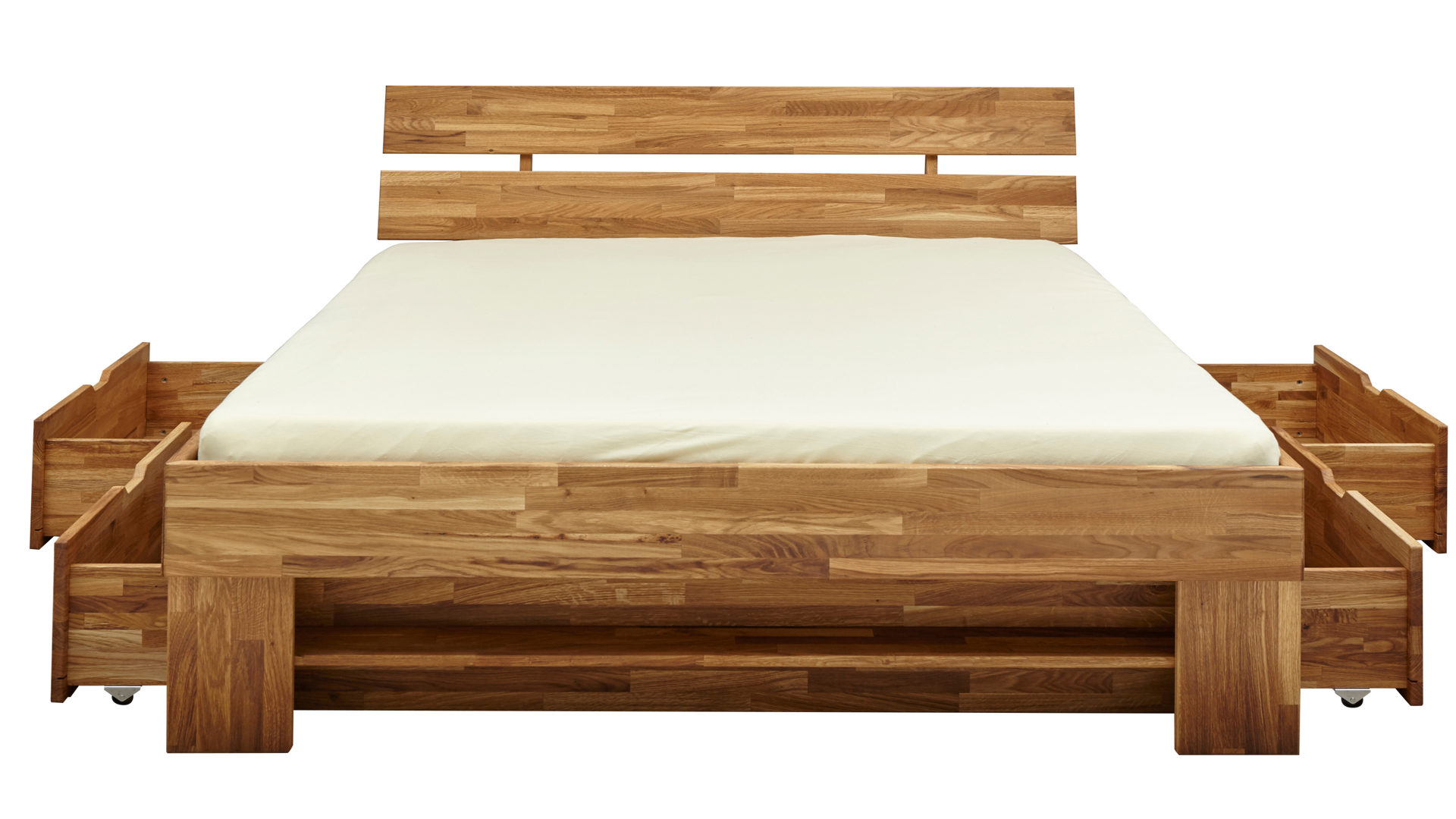 Sie liegen wunderbar bequem auf dem Bett aus keilverzinkter geölter Wildeiche, das insgesamt ca. 145 x 88 x 215 cm (BxHxT) groß ist. Außergewöhnlich praktisch ist der Stauraum, der sich Ihnen unter dem Einzelbettgestell in vier inkludierten Bettkästen bietet. Die Kästen auf Rollen haben Innenmaße von ca. 78 x 18 x 64 cm (BxHxT) und schaffen viel Platz für Kissen und Decken.